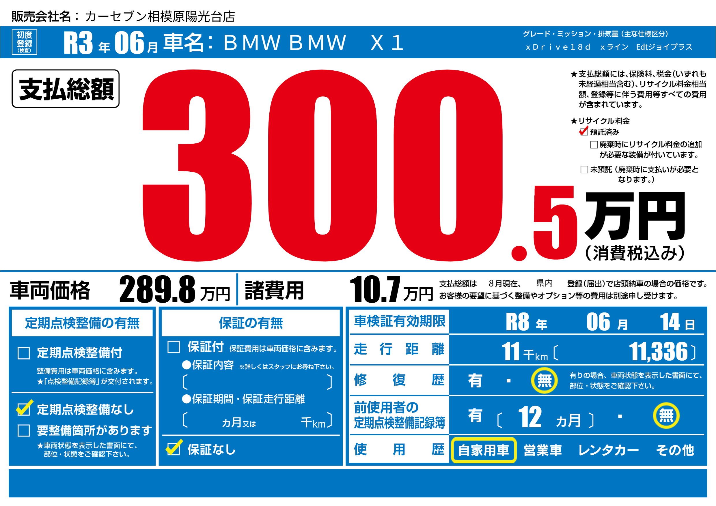 | 車名 | BMW BMW X1 | グレード ミッション 排気量 |