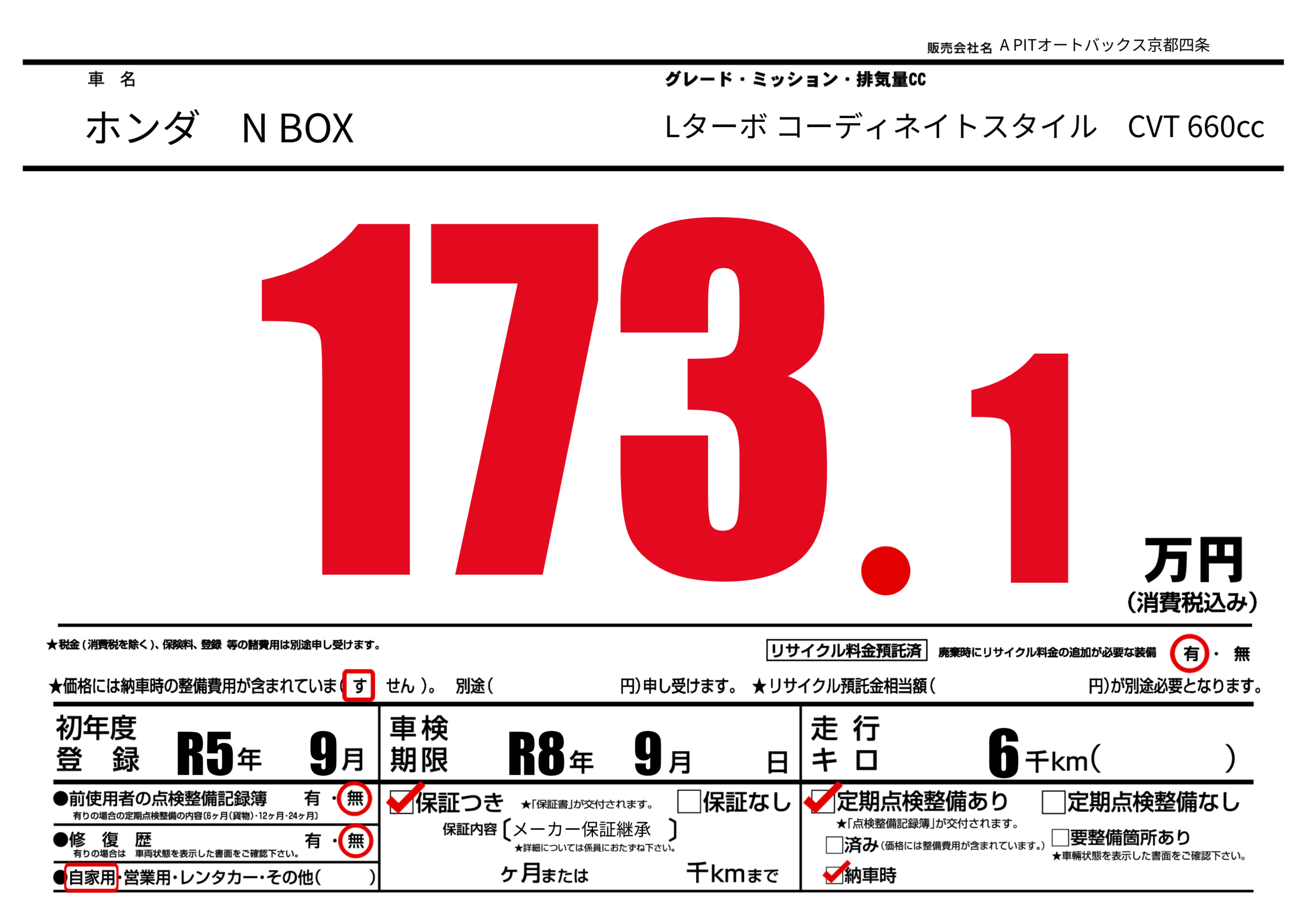 あり | 車検制限 | R8年9月---月 |