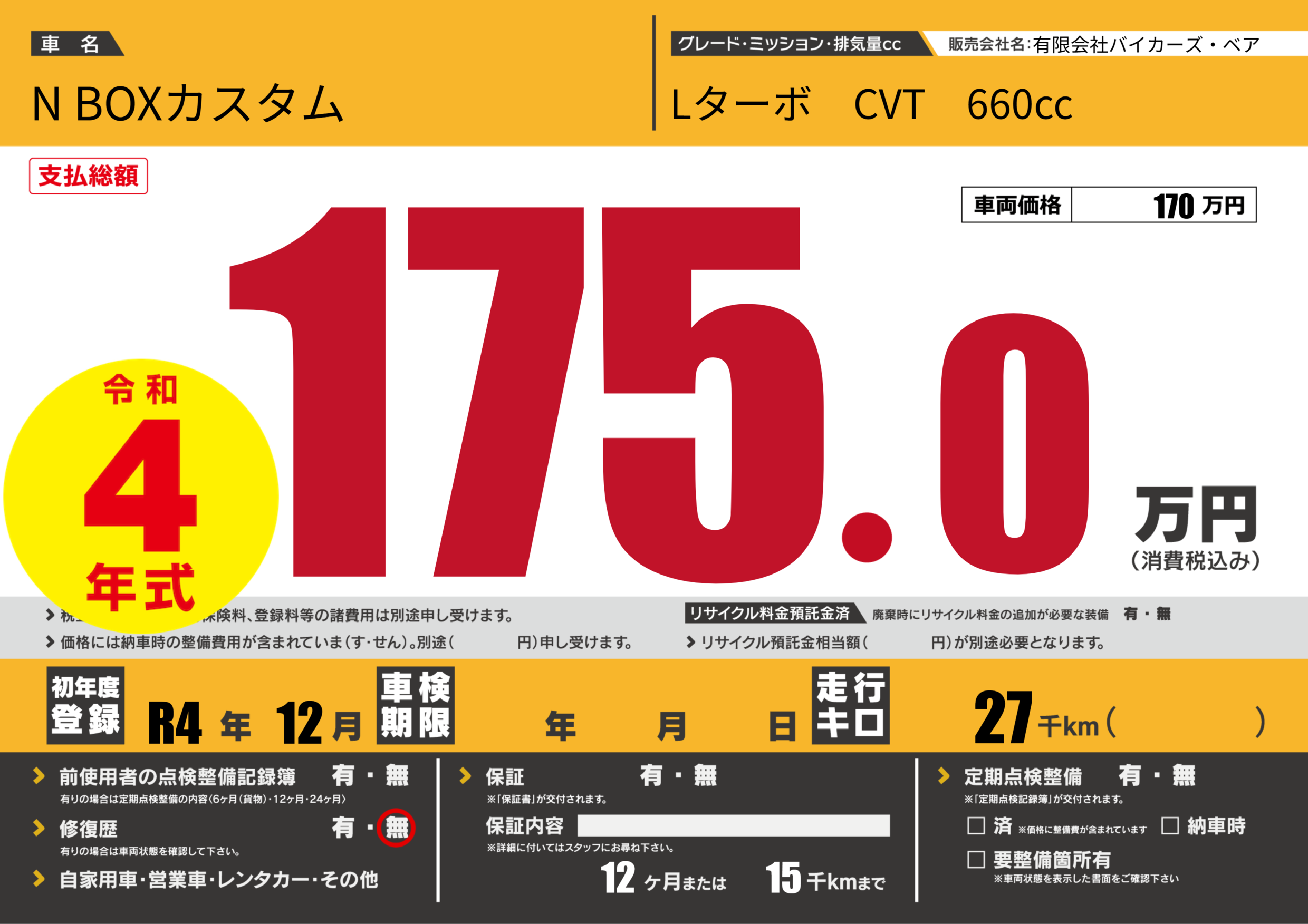 | 車名 | N BOXカスタム | グレード ミッション 排気量 |