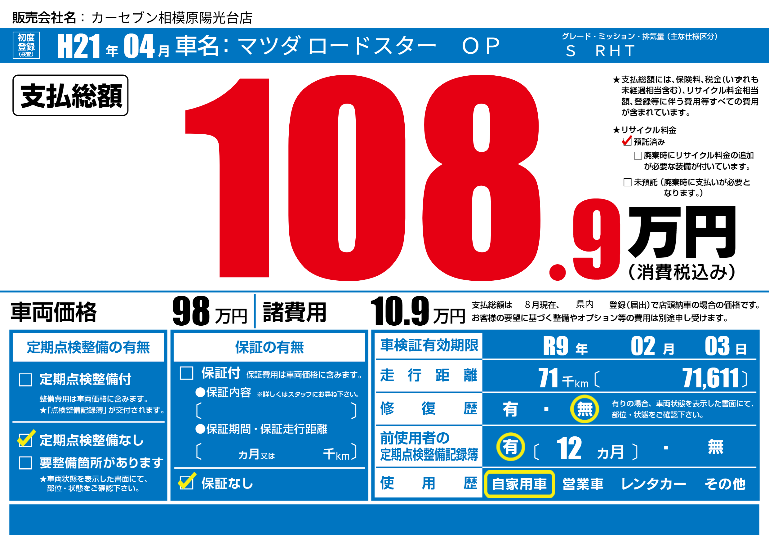 なし | 車検制限 | R9年02月03月 |