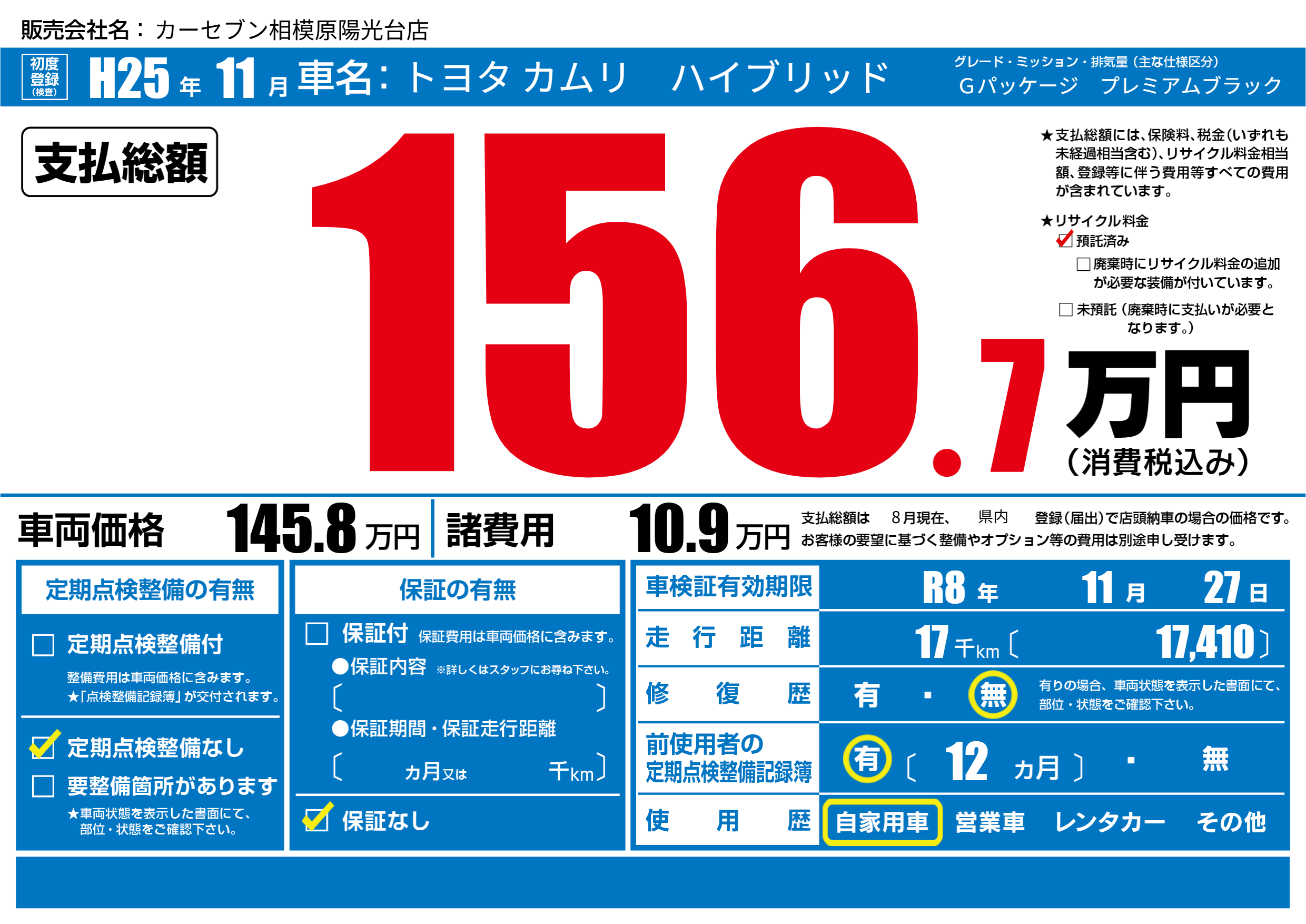 | 車名 | トヨタ カムリ ハイブリッド | グレード ミッション 排気量 |