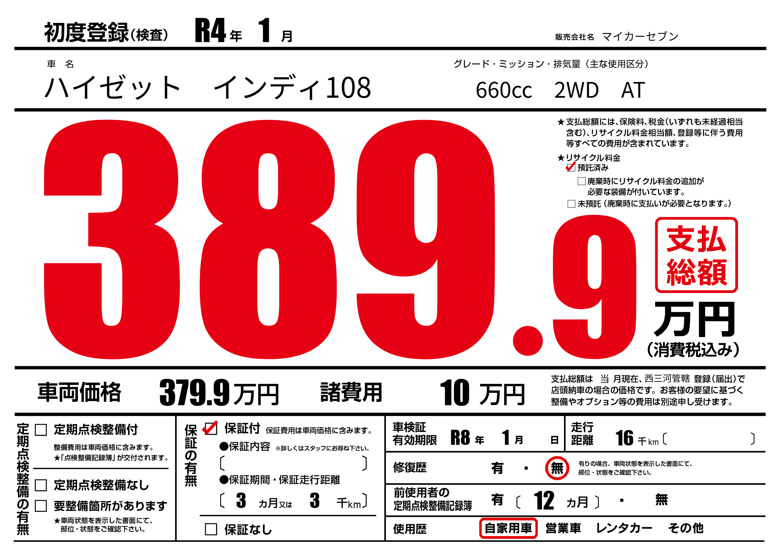 | 車名 | ハイゼット インディ108 | グレード ミッション 排気量 |