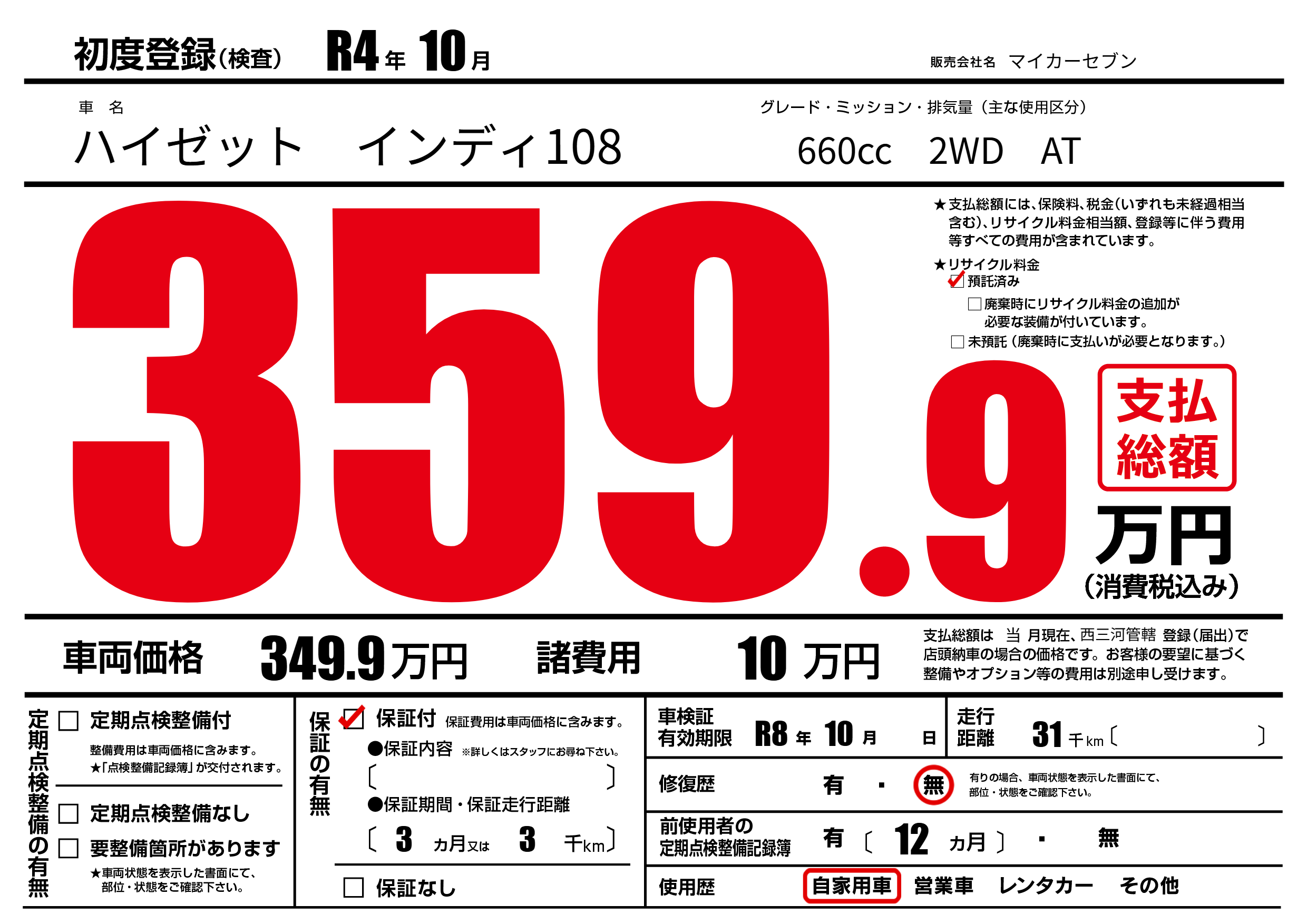 | 車名 | ハイゼット インディ108 | グレード ミッション 排気量 |