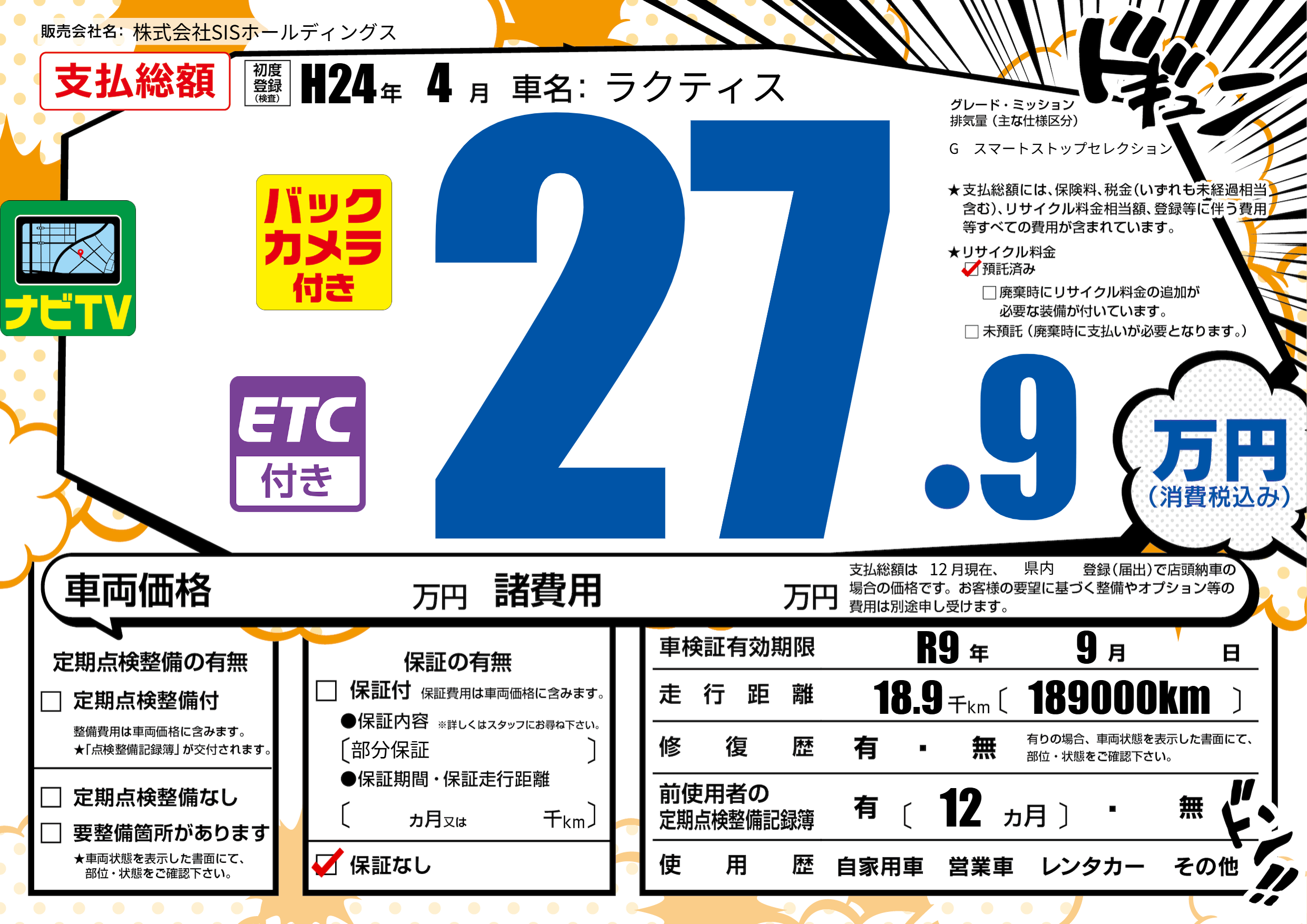 | 車名 | ラクティス | グレード ミッション 排気量 |