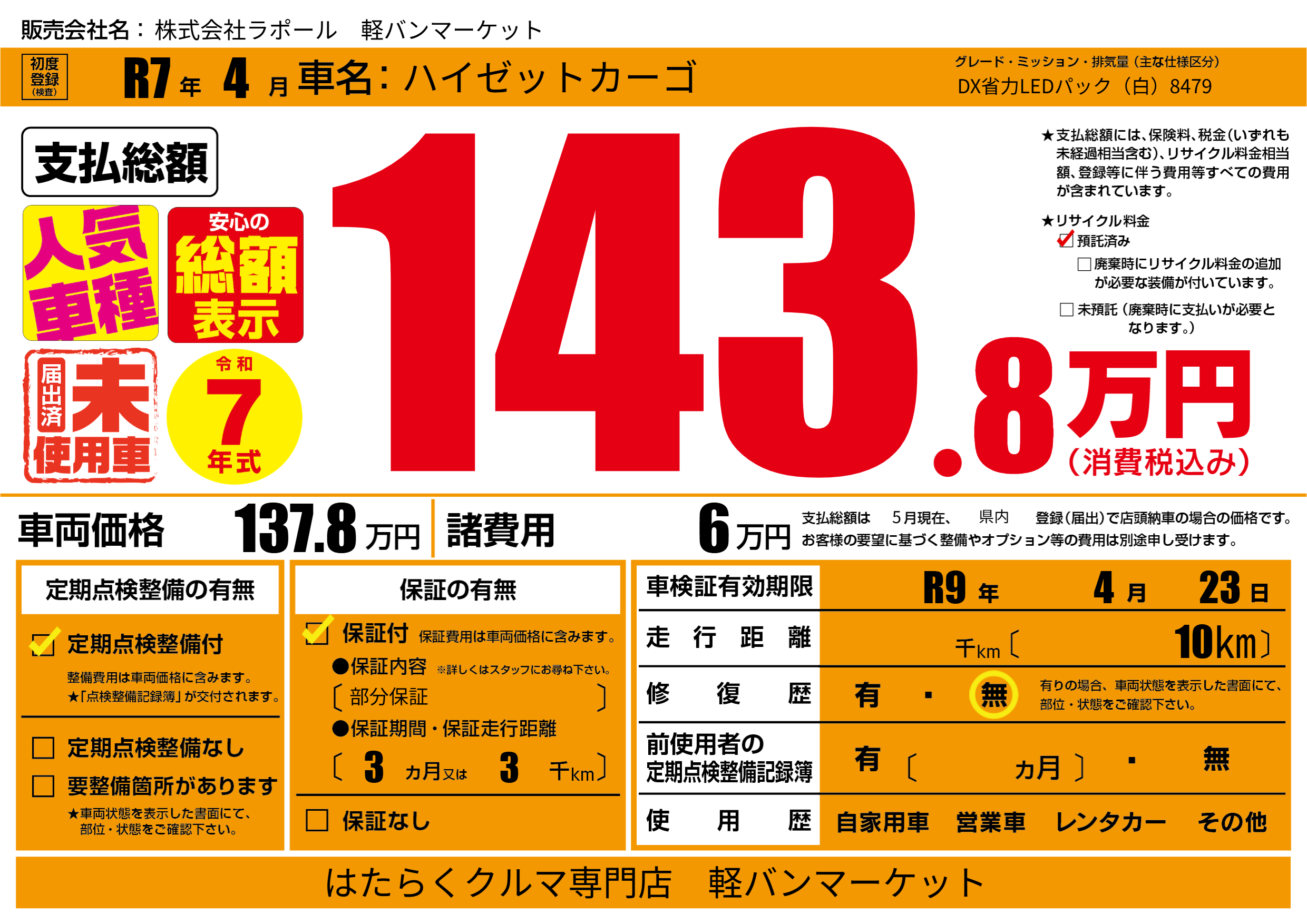 | 車名 | ハイゼットカーゴ | グレード ミッション 排気量 |