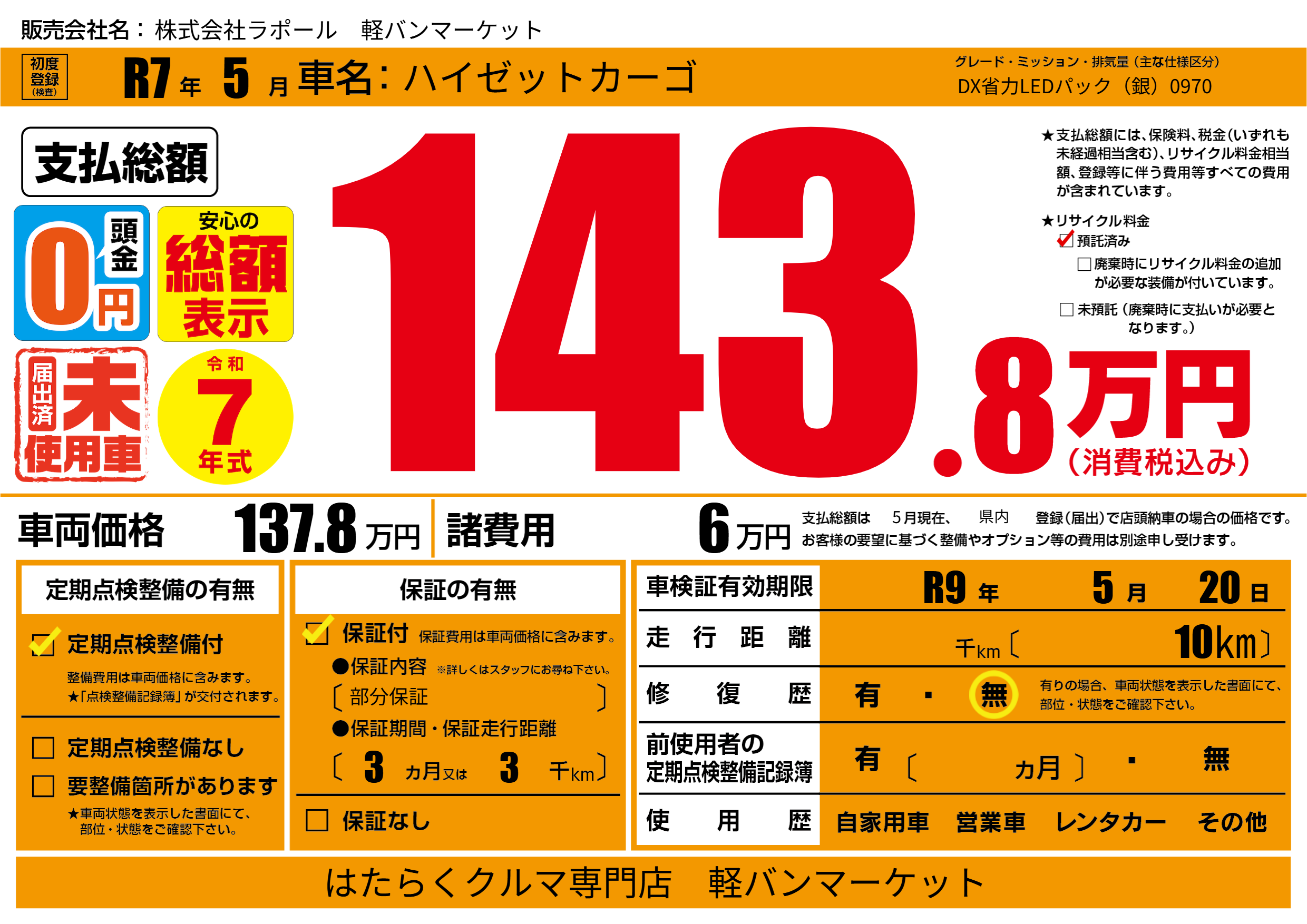 | 車名 | ハイゼットカーゴ | グレード ミッション 排気量 |
