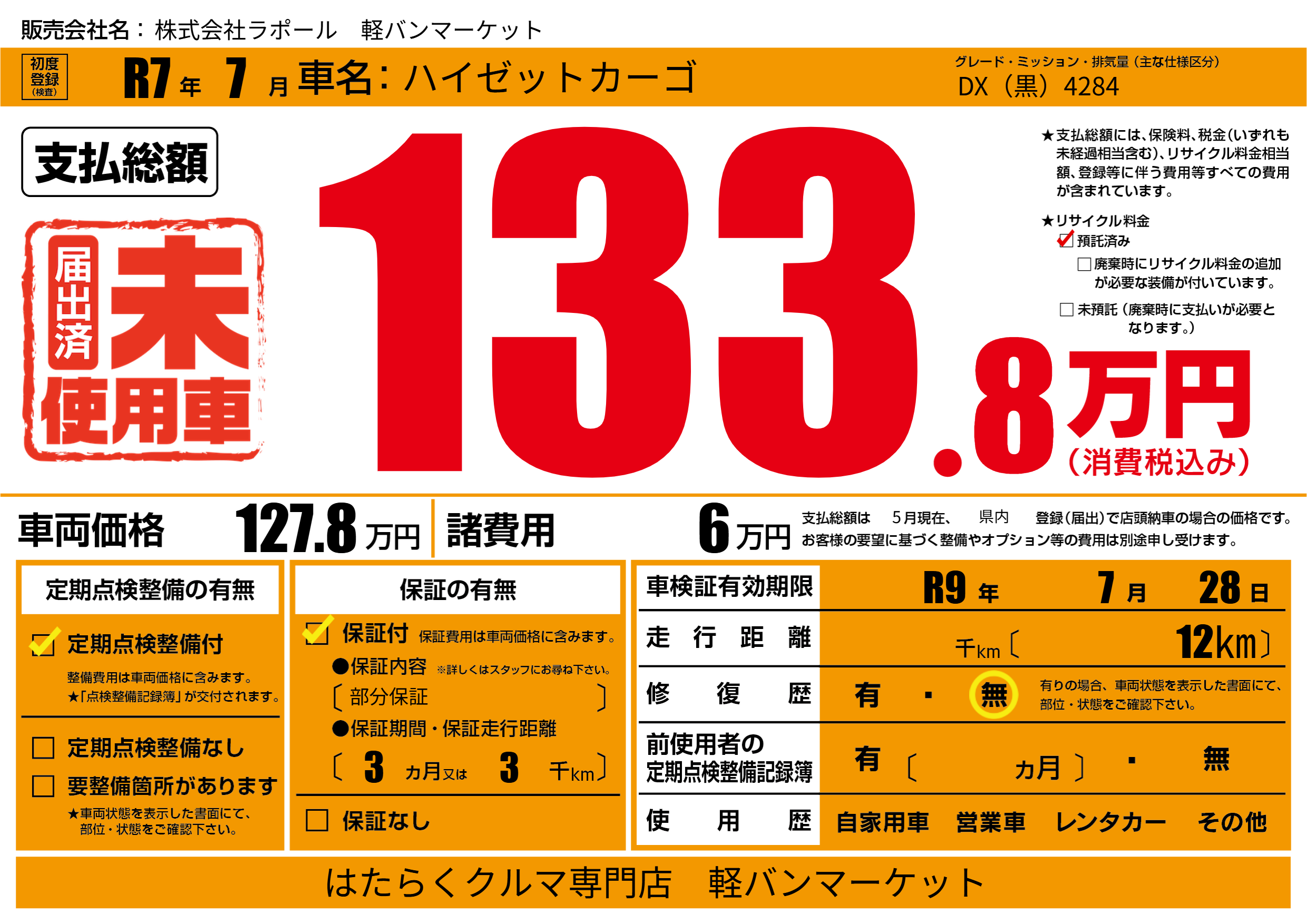 なし | 車検制限 | R9年7月28月 |