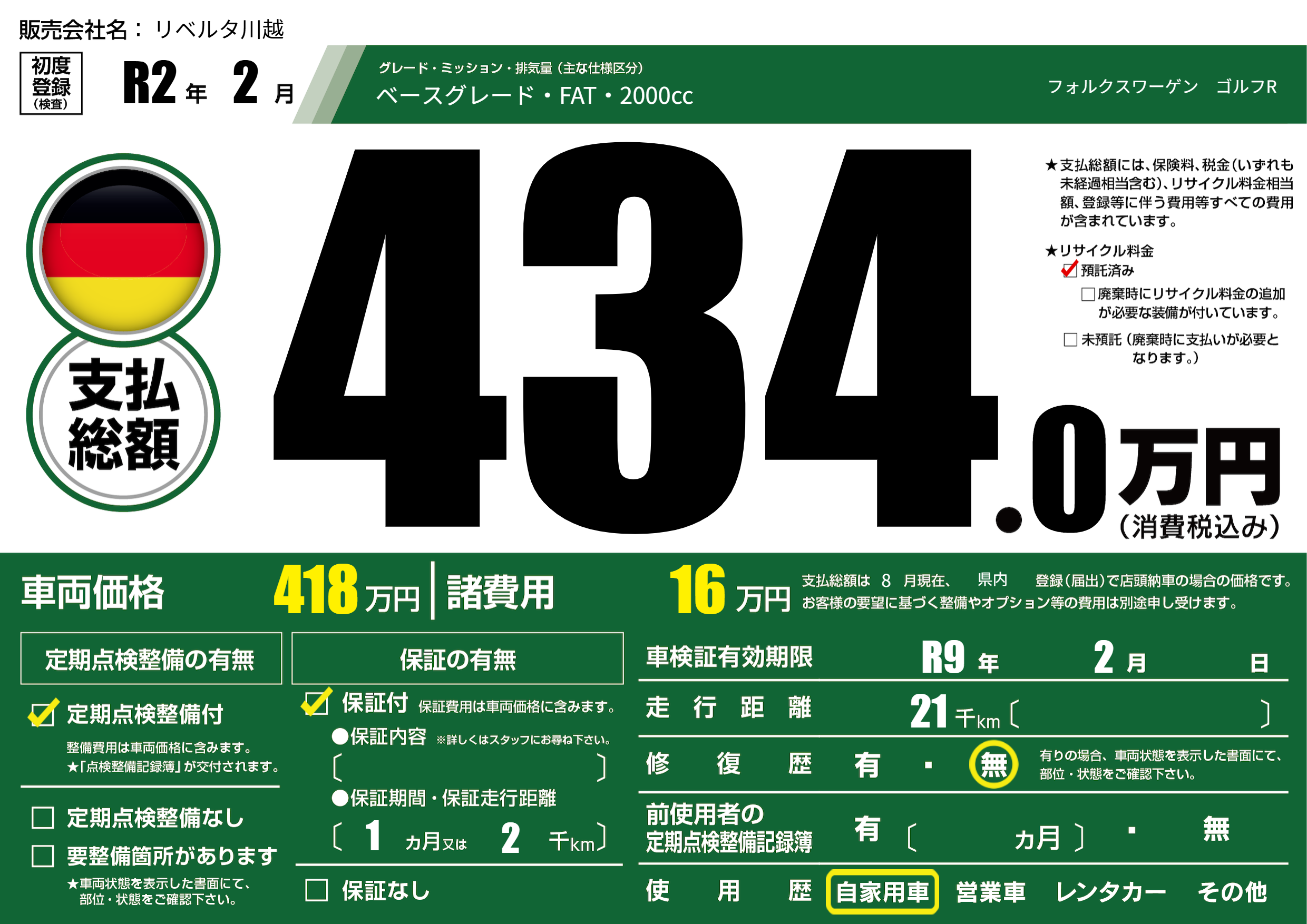 | 車名 | フォルクスワーゲン ゴルフR | グレード ミッション 排気量 |
