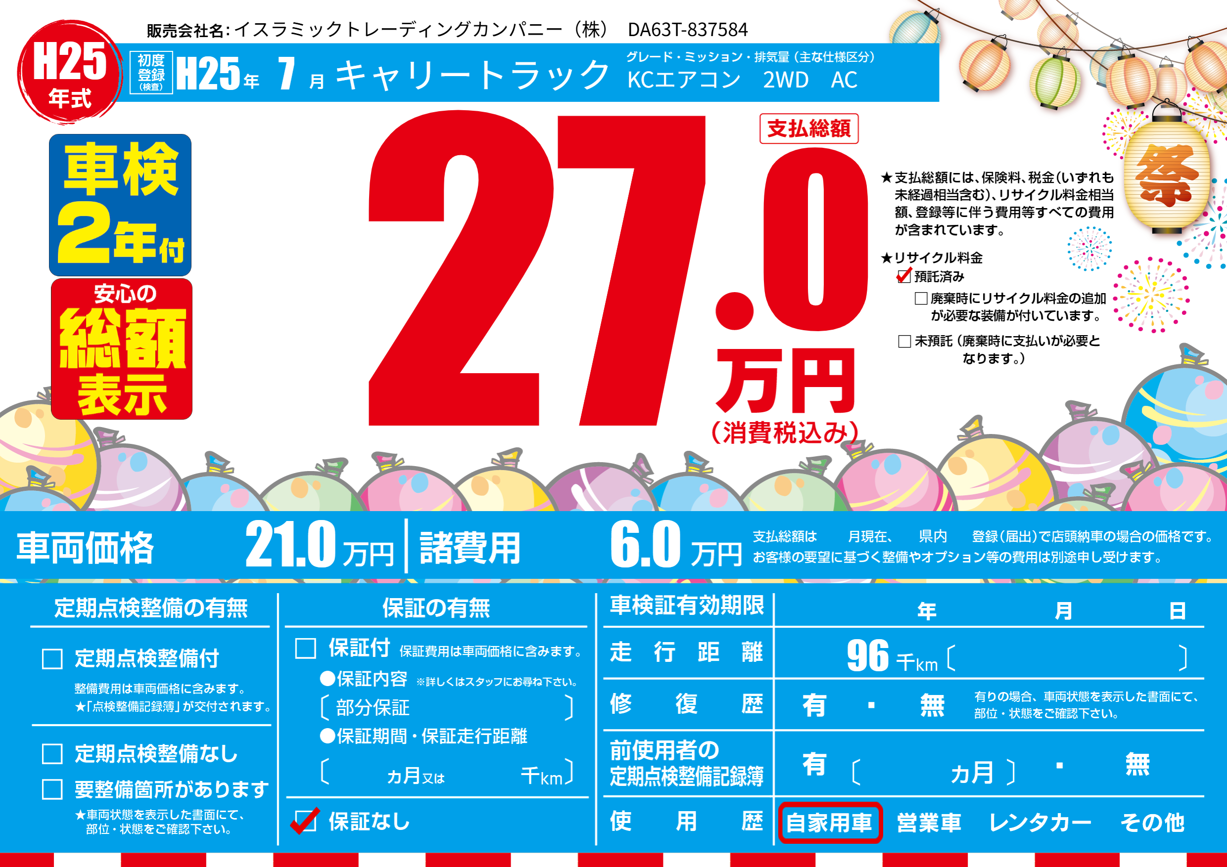 | 走行キロ | 9.6万km | 初年度登録 | H25年7月 |