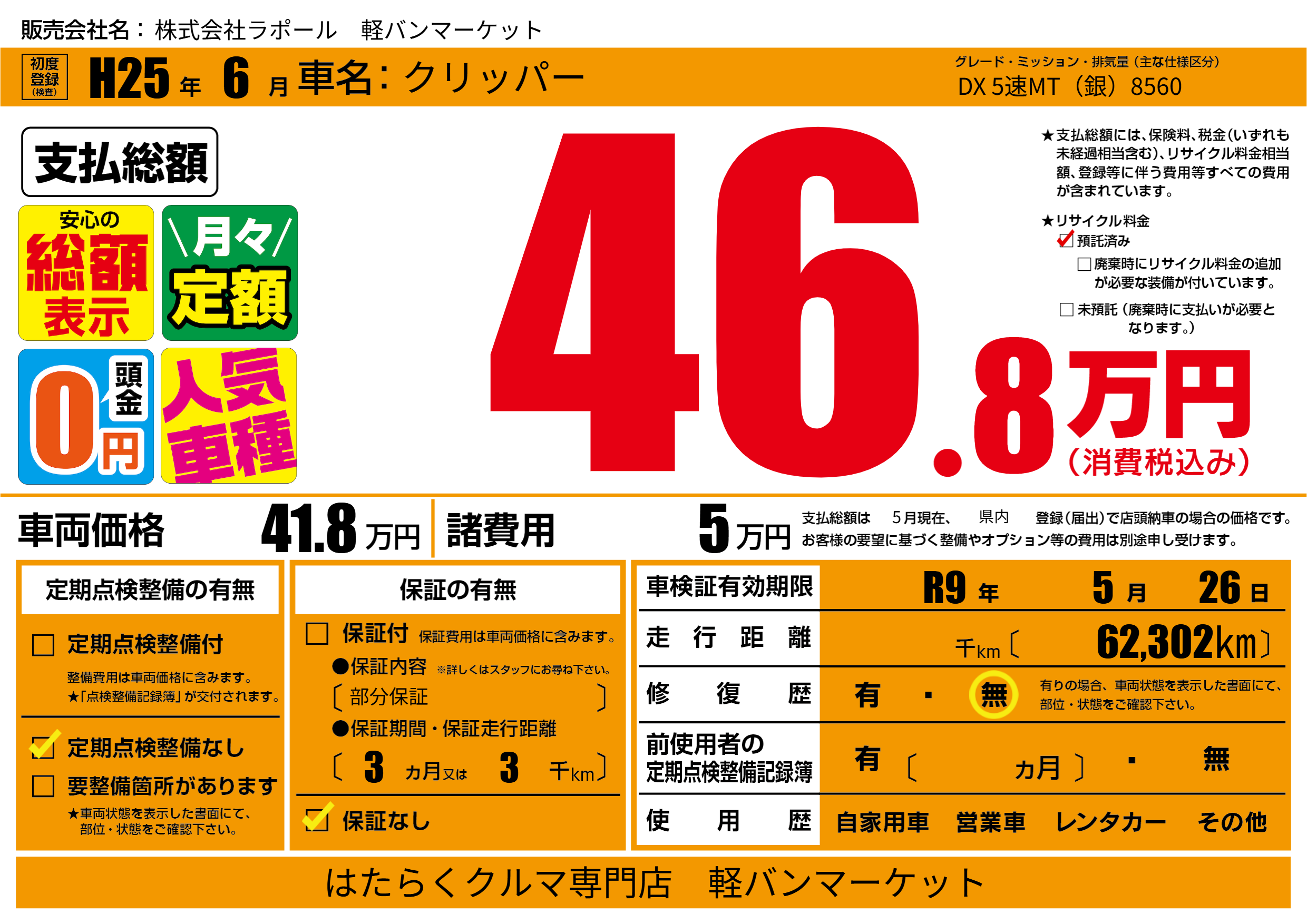 なし | 車検制限 | R9年5月26月 |