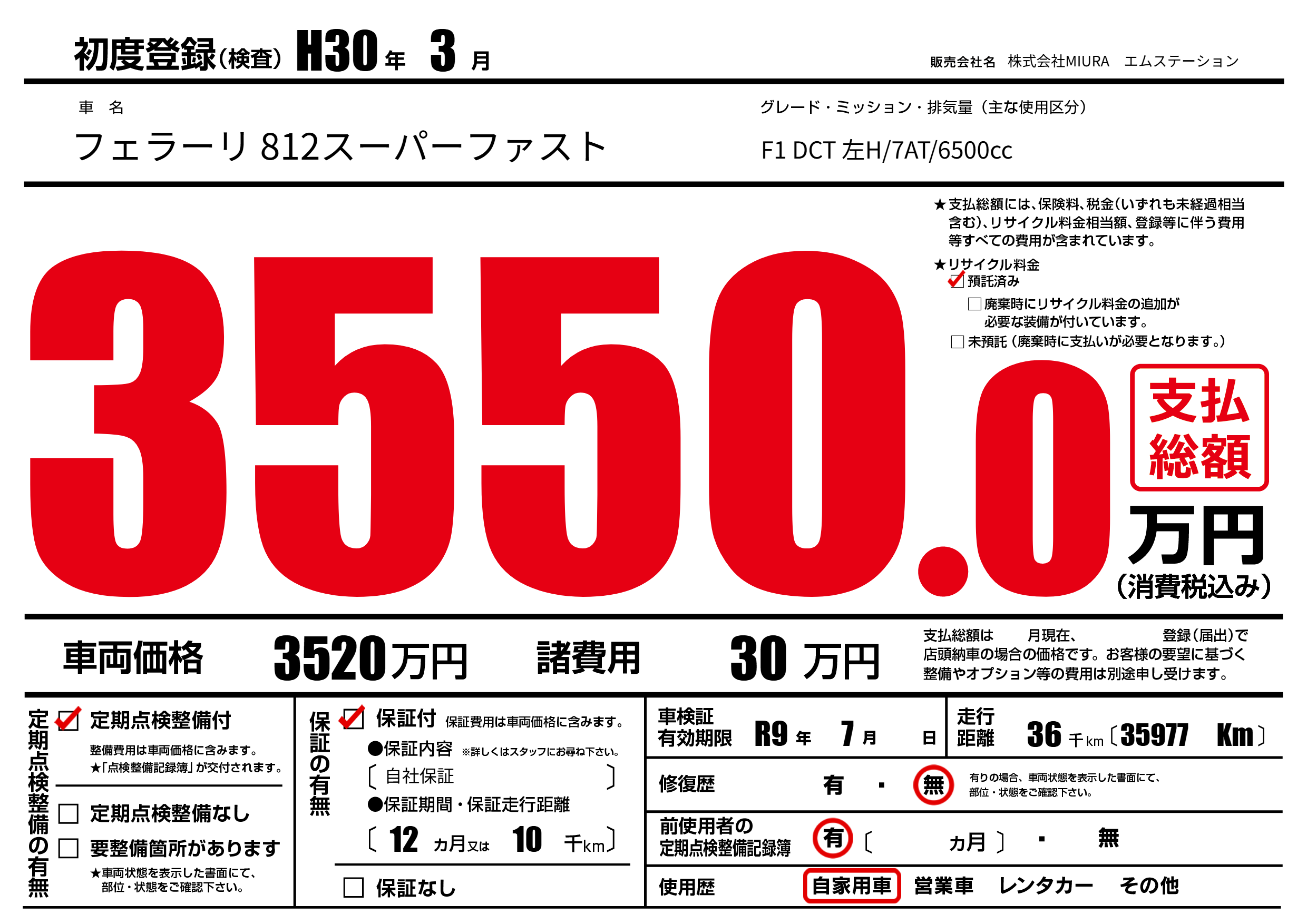 | 車名 | フェラーリ 812スーパーファスト | グレード ミッション 排気量 |