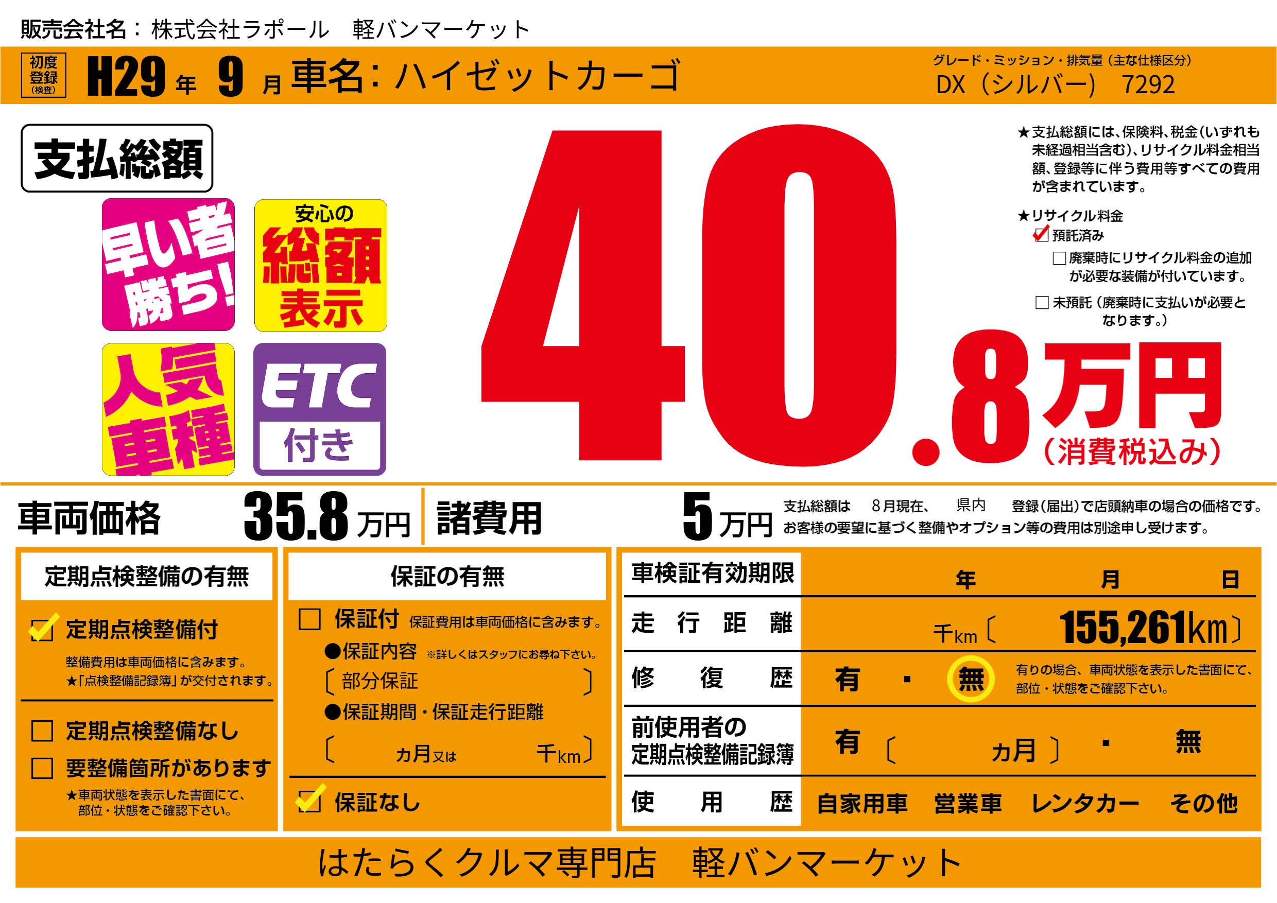 | 車名 | ハイゼットカーゴ | グレード ミッション 排気量 |
