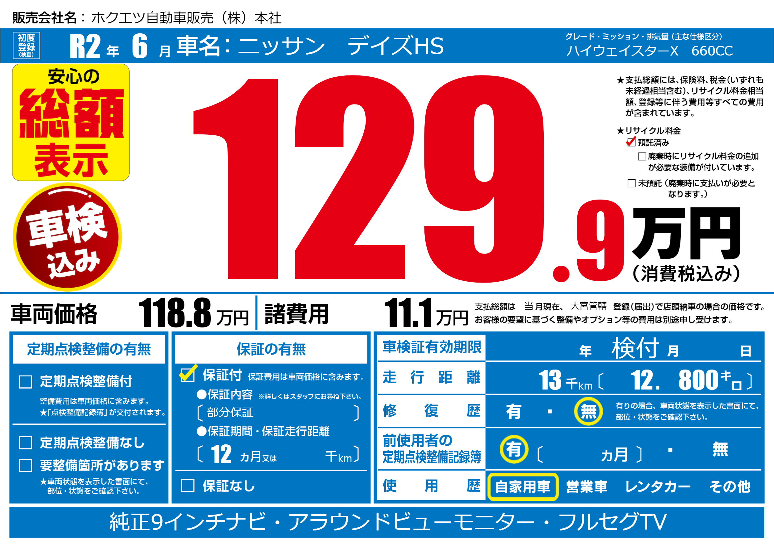 | 車名 | ニッサン デイズHS | グレード ミッション 排気量 |