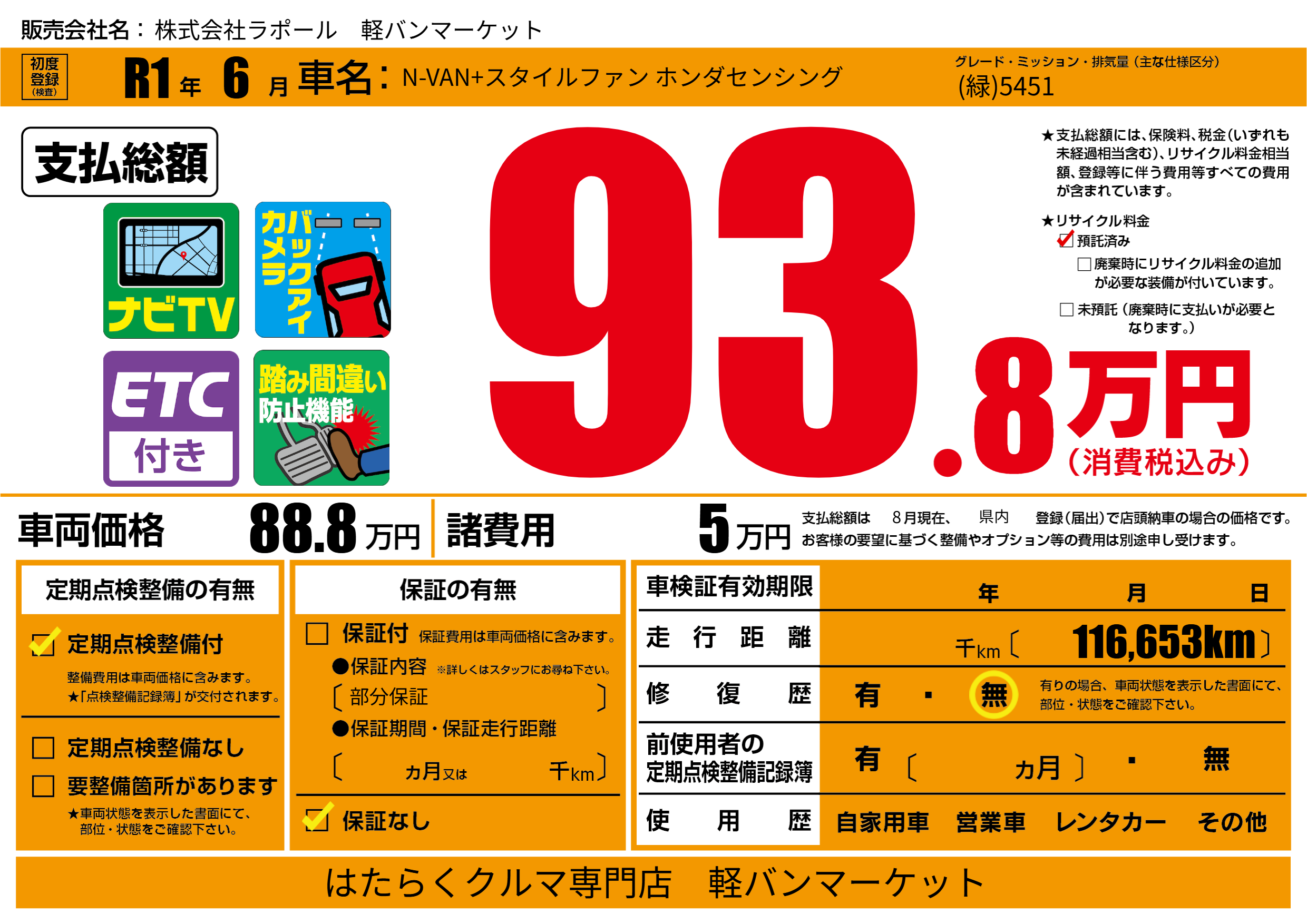 | 車名 | N-VAN+スタイルファン ホンダセンシング | グレード ミッション 排気量 |