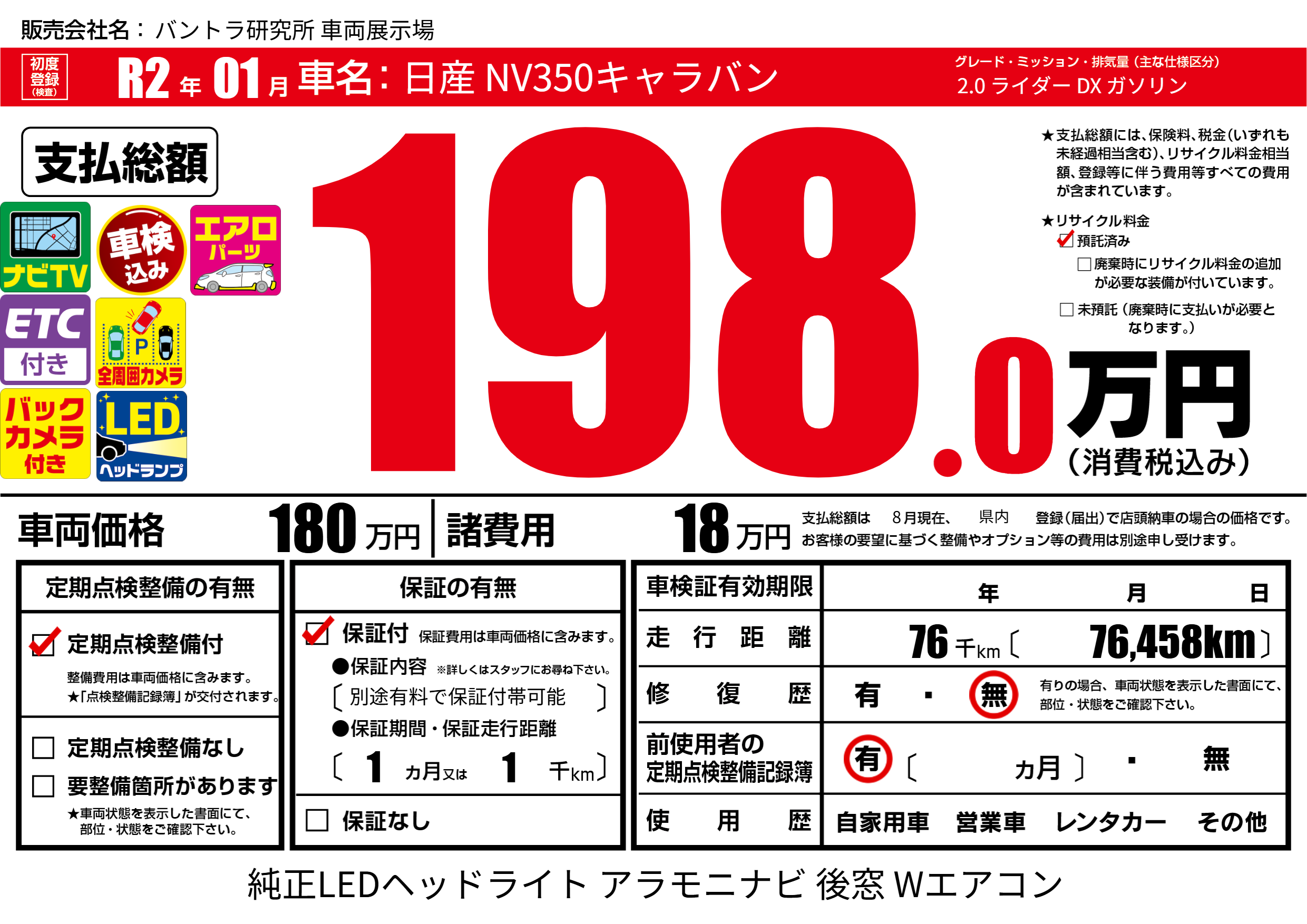 | 車名 | 日産 NV350キャラバン | グレード ミッション 排気量 |