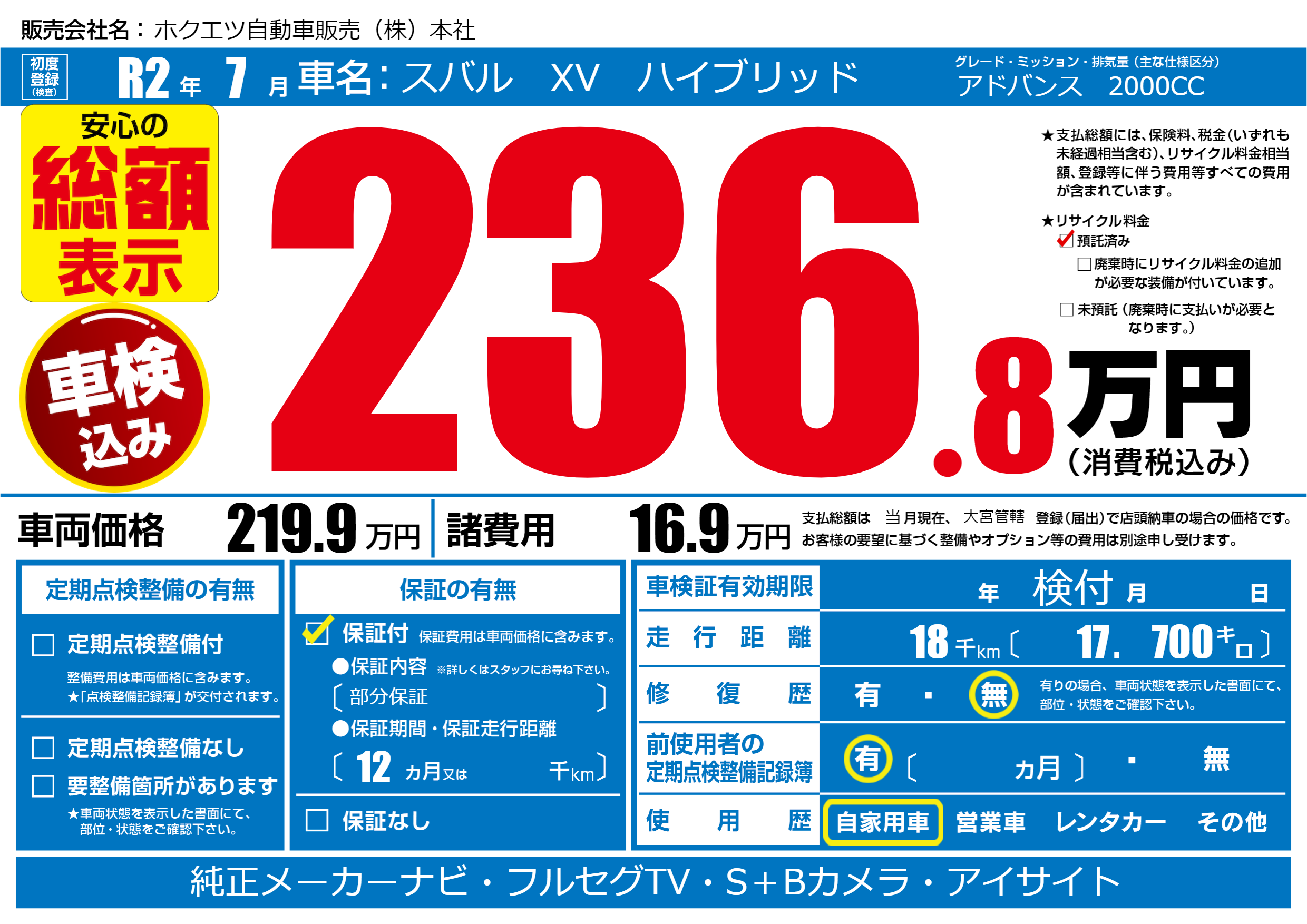 | 車名 | スバル XV ハイブリッド | グレード ミッション 排気量 |