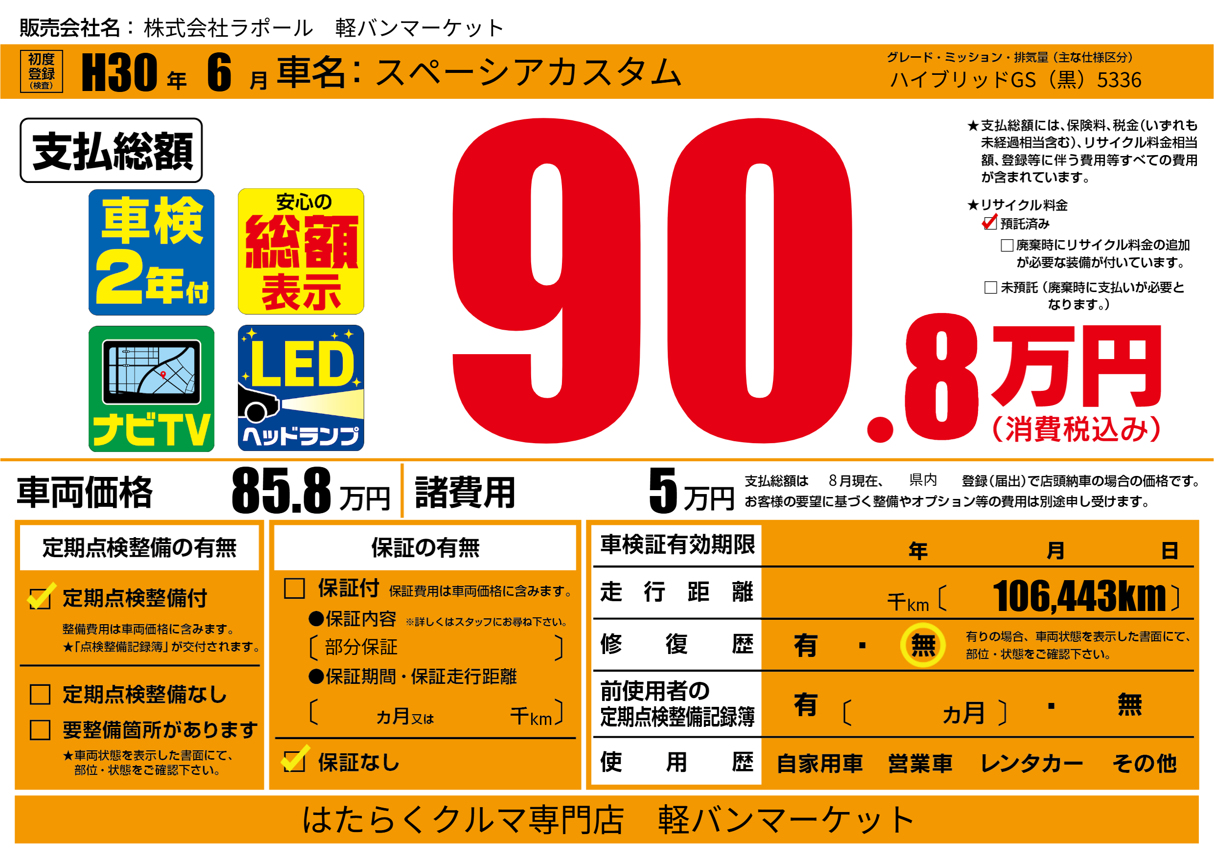 | 走行キロ | - | 初年度登録 | H30年6月 |