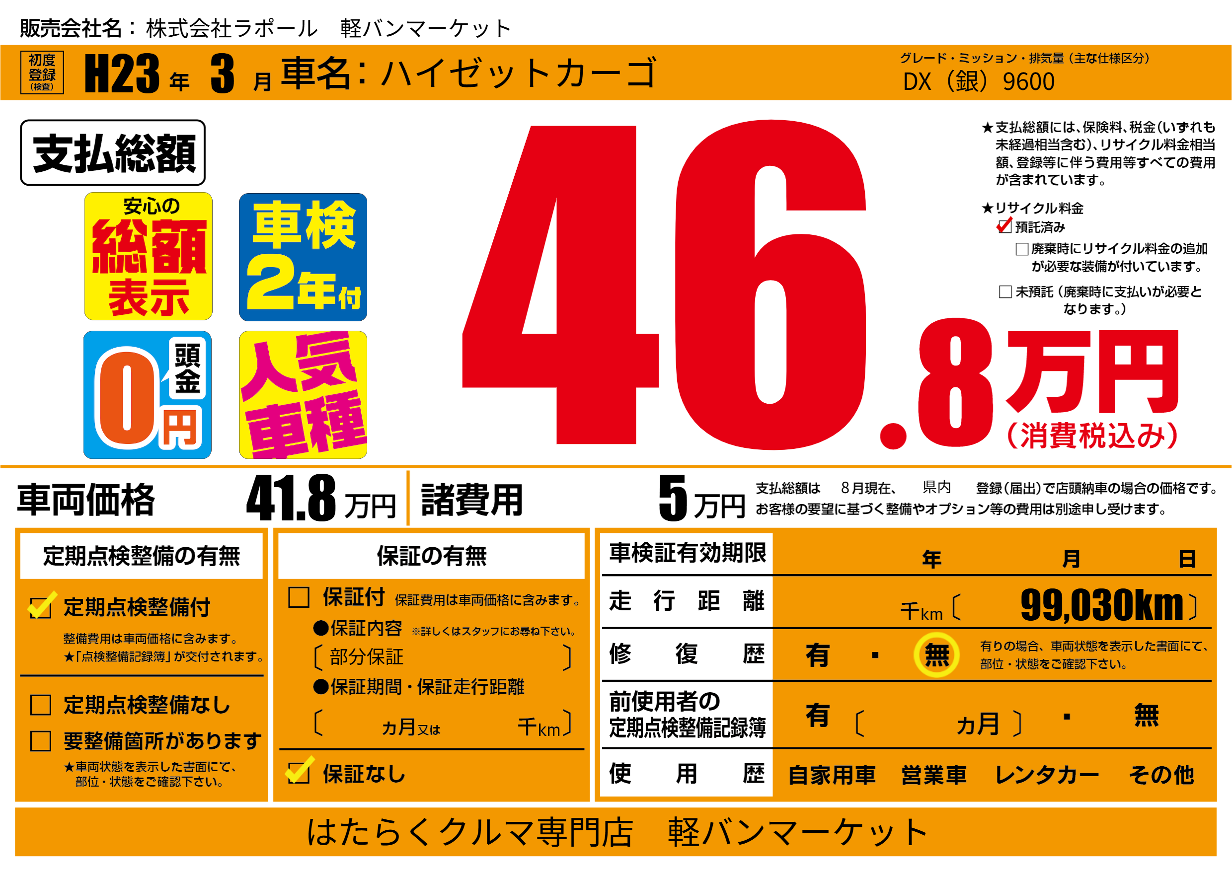 保証なし 保証内容(部分保証) ---ヶ月または()千kmまで |