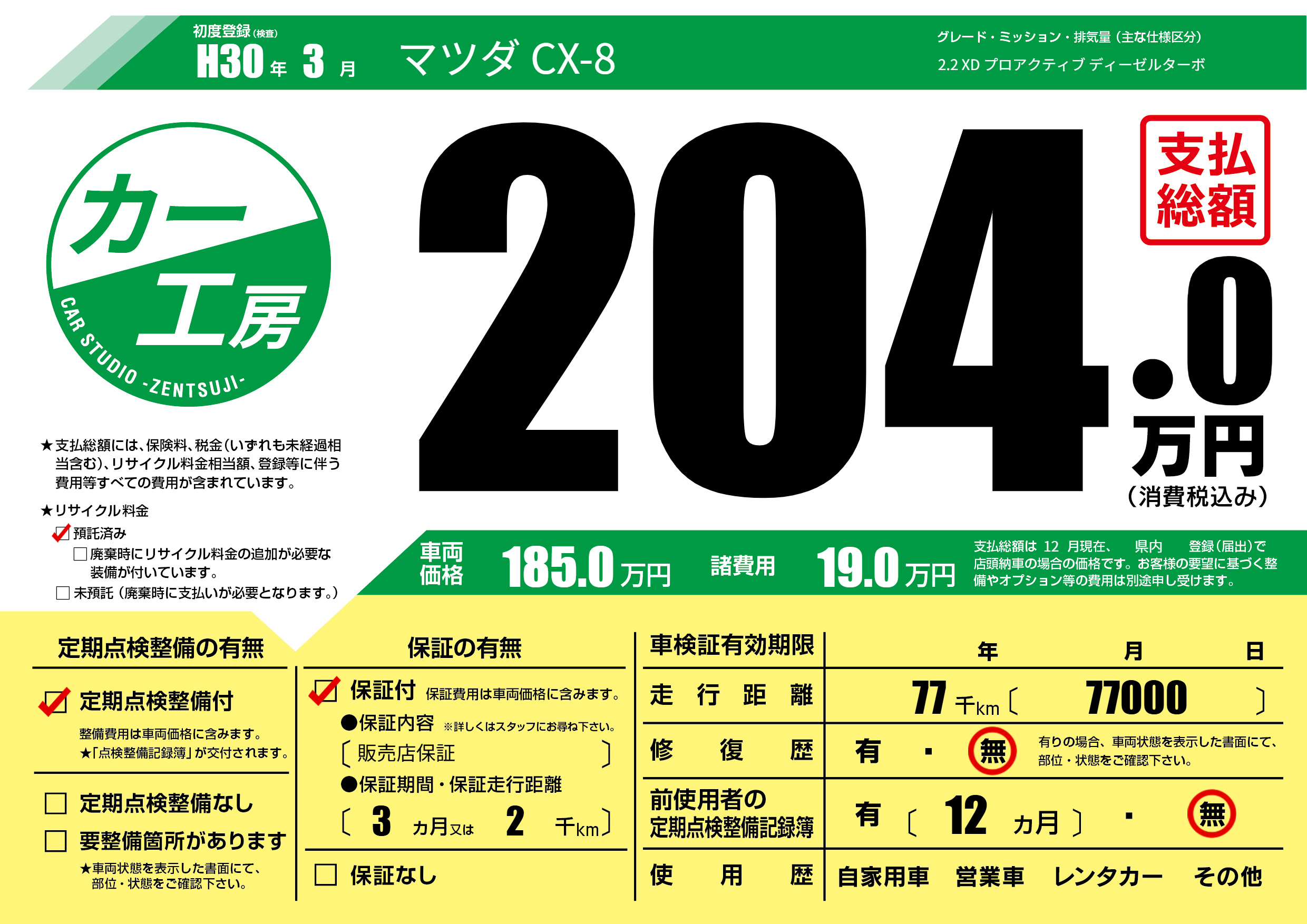 | 走行キロ | 7.7万km | 初年度登録 | H30年3月 |