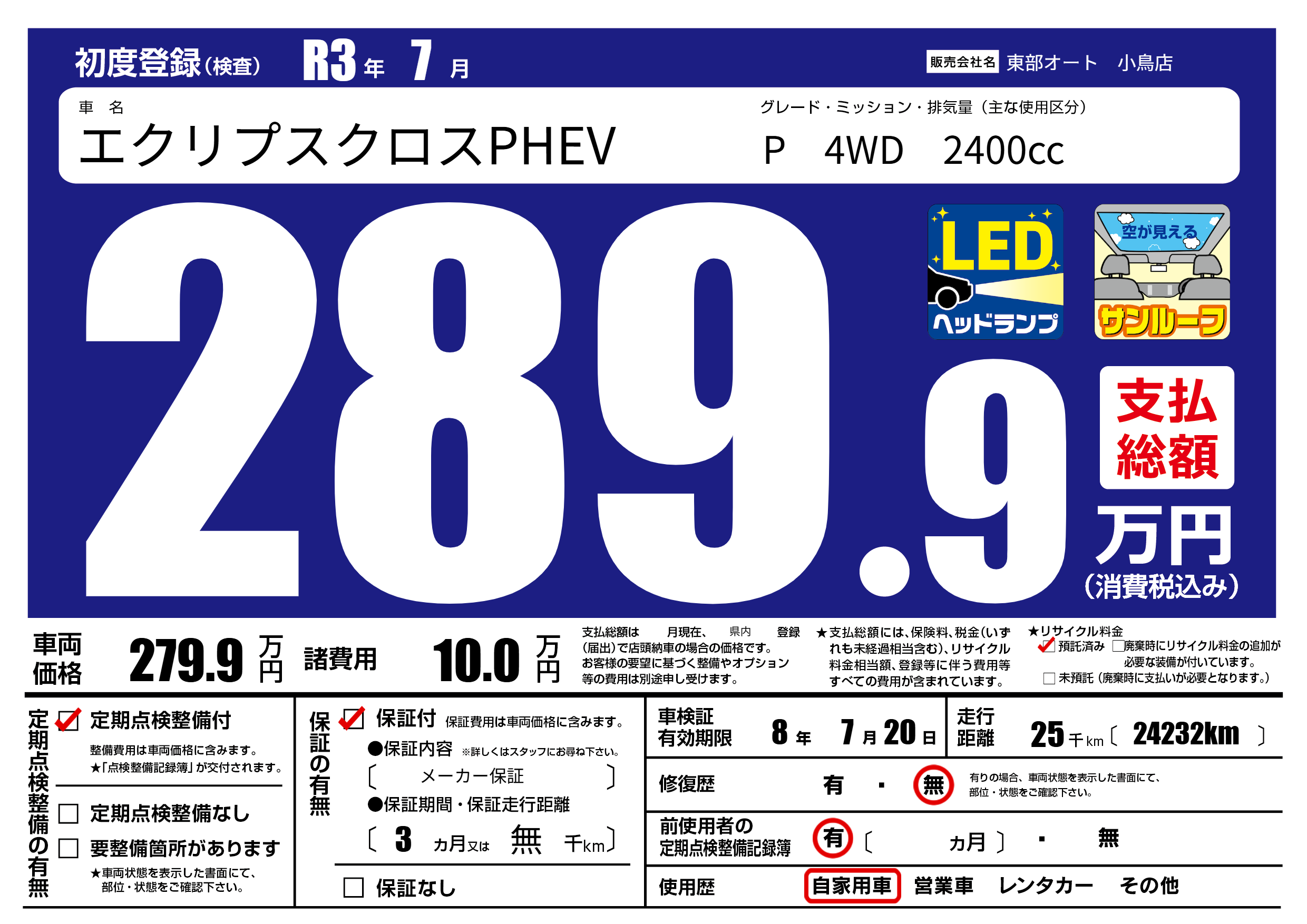 | 車名 | エクリプスクロスPHEV | グレード ミッション 排気量 |