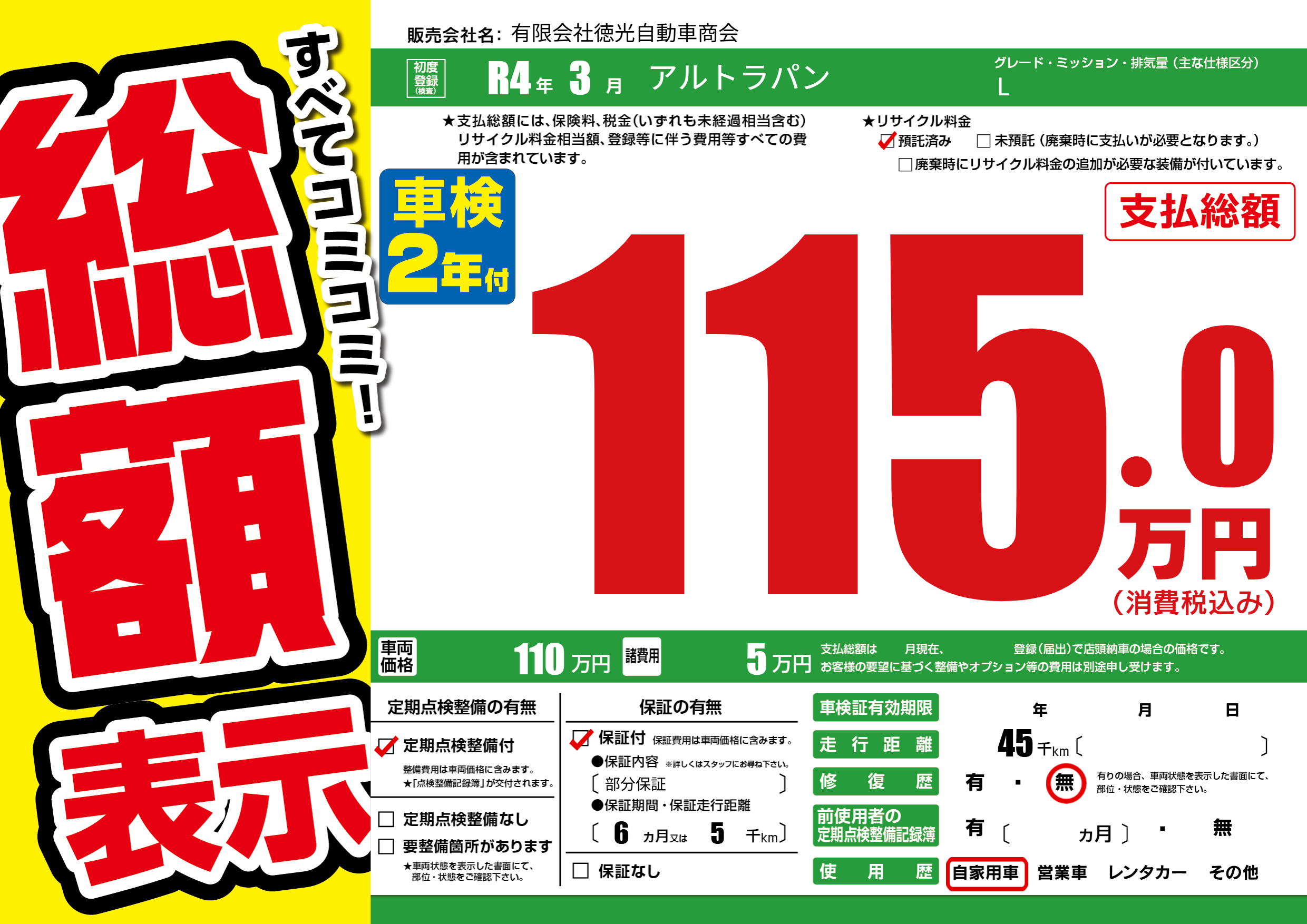 | 走行キロ | 4.5万km | 初年度登録 | R4年3月 |