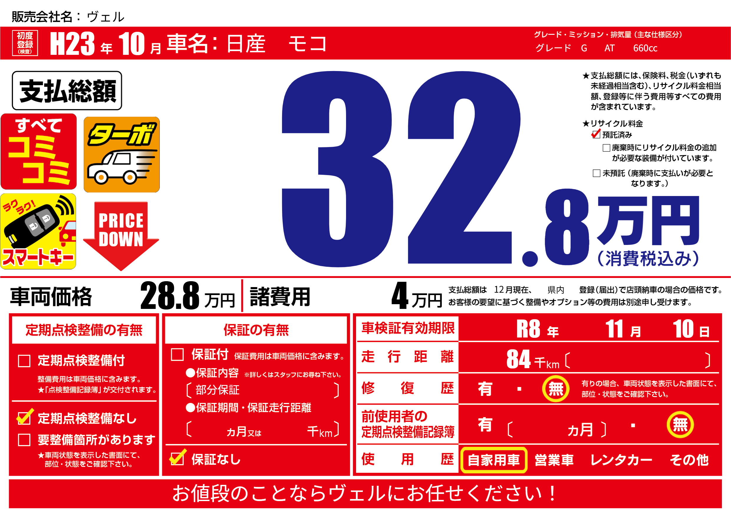 | 車名 | 日産 モコ | グレード ミッション 排気量 |