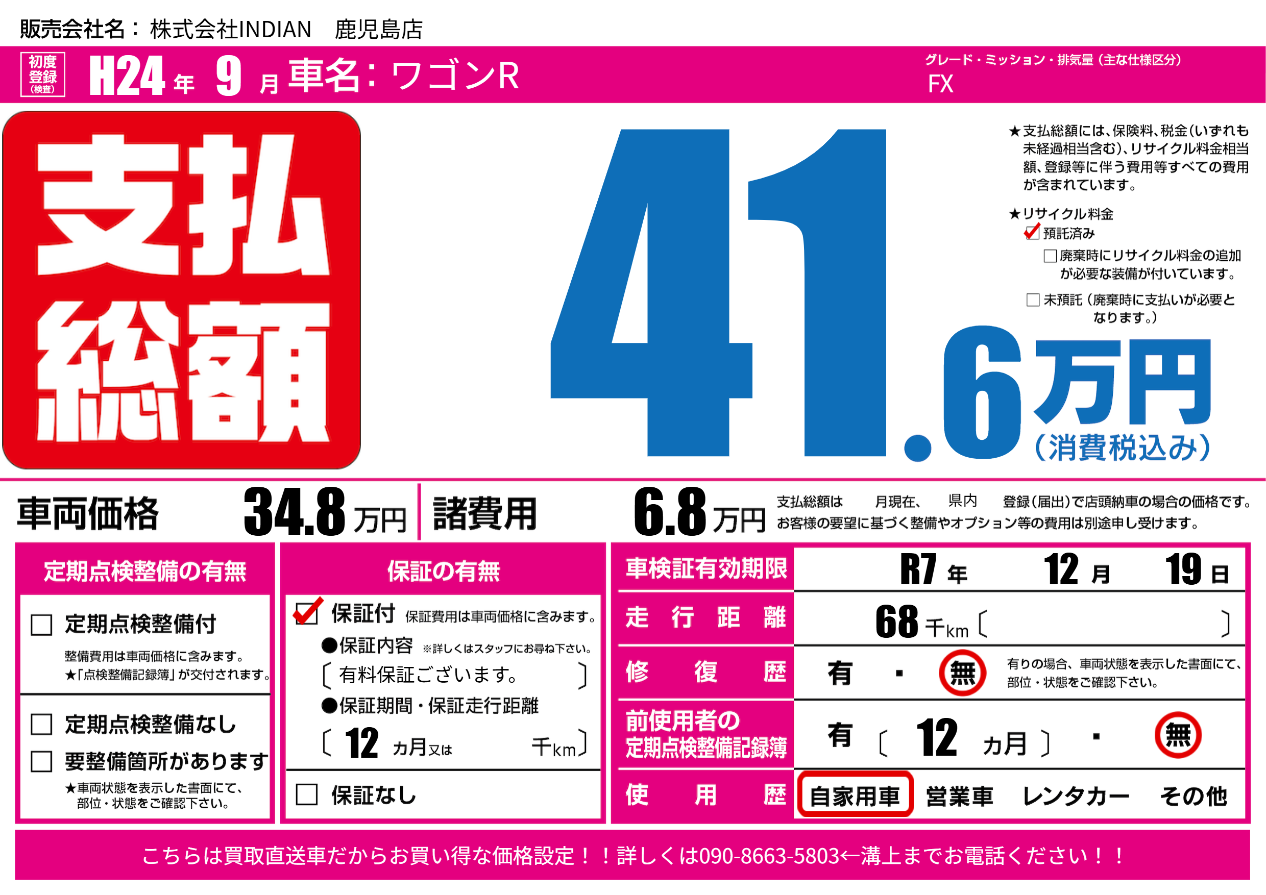 | 走行キロ | 6.8万km | 初年度登録 | H24年9月 |
