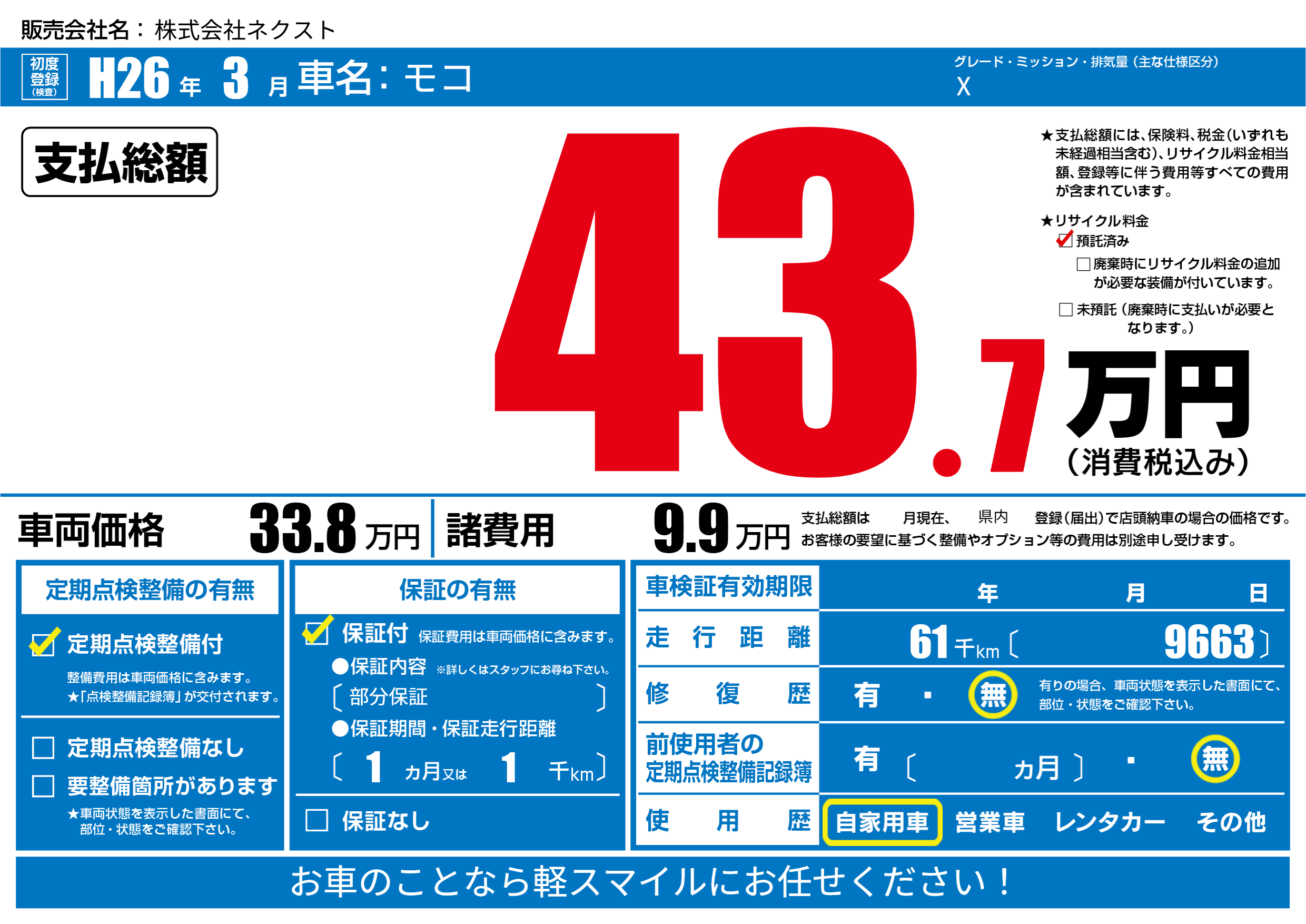 | 走行キロ | 6.1万km | 初年度登録 | H26年3月 |