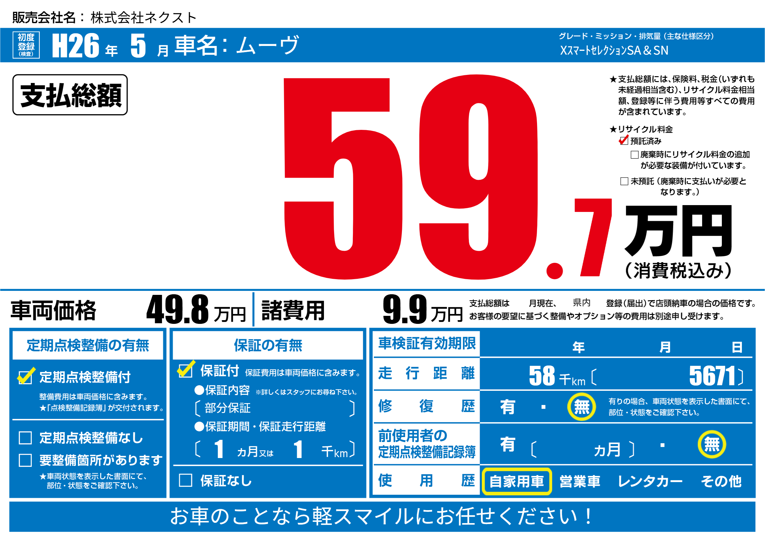 | 走行キロ | 5.8万km | 初年度登録 | H26年5月 |