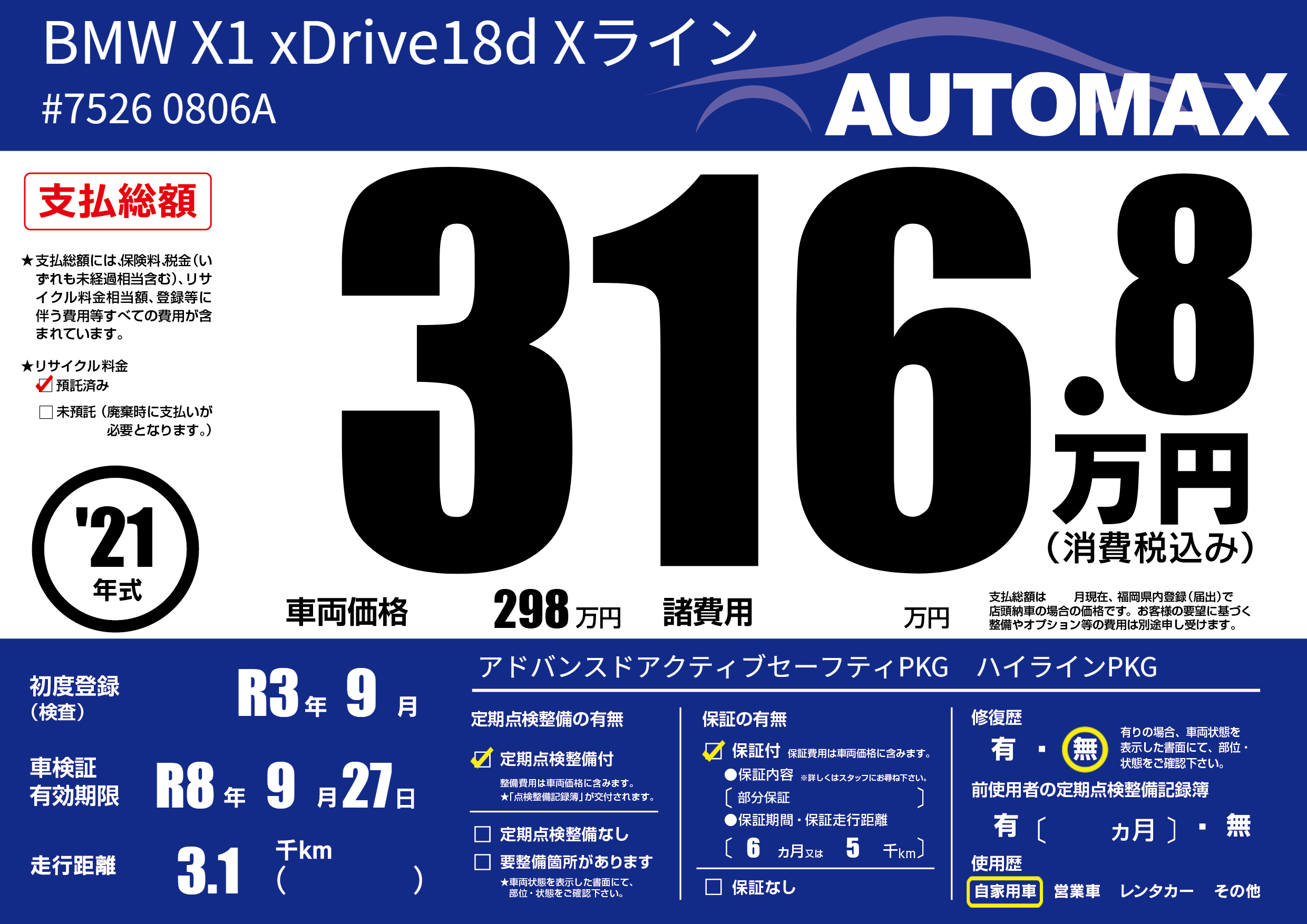 | 車名 | BMW X1 xDrive18d Xライン | グレード ミッション 排気量 |