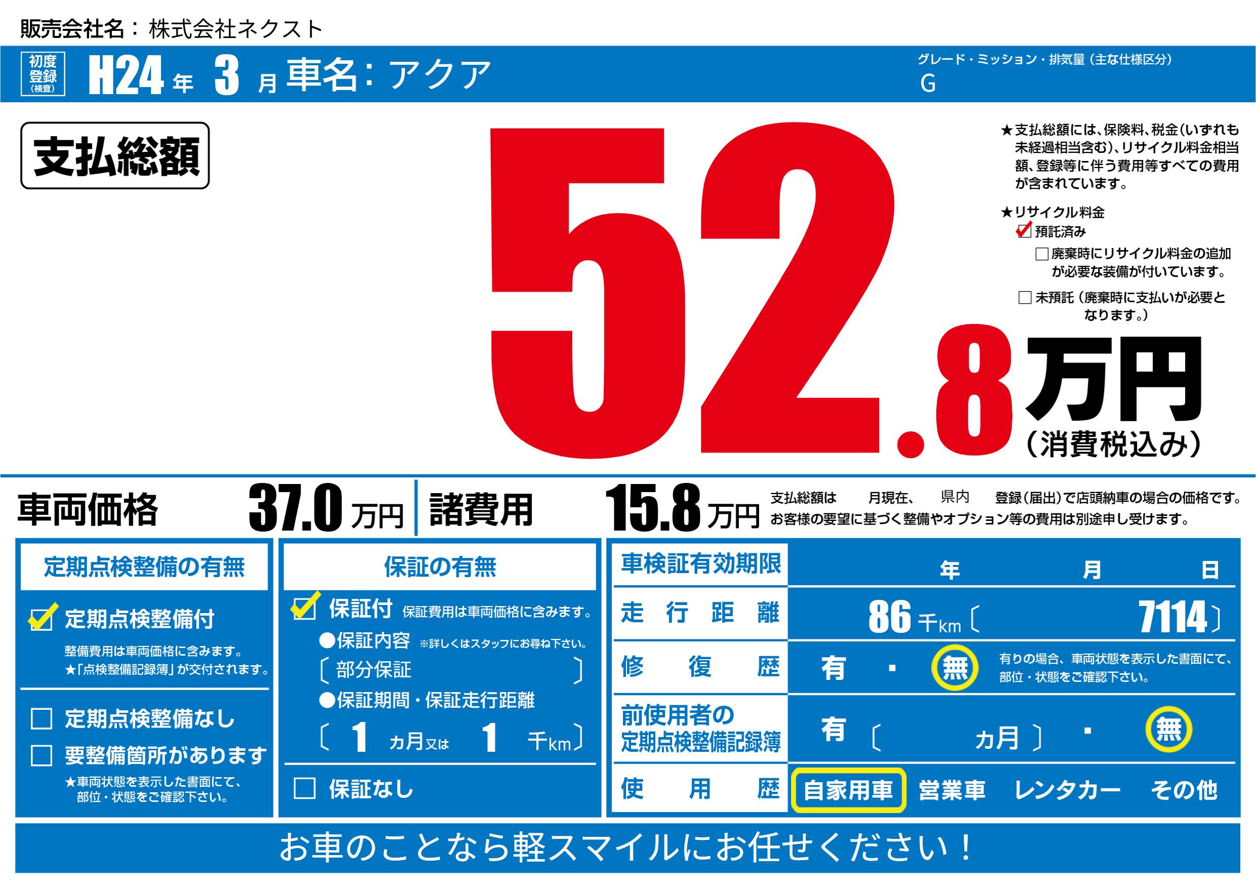 | 車名 | アクア | グレード ミッション 排気量 |