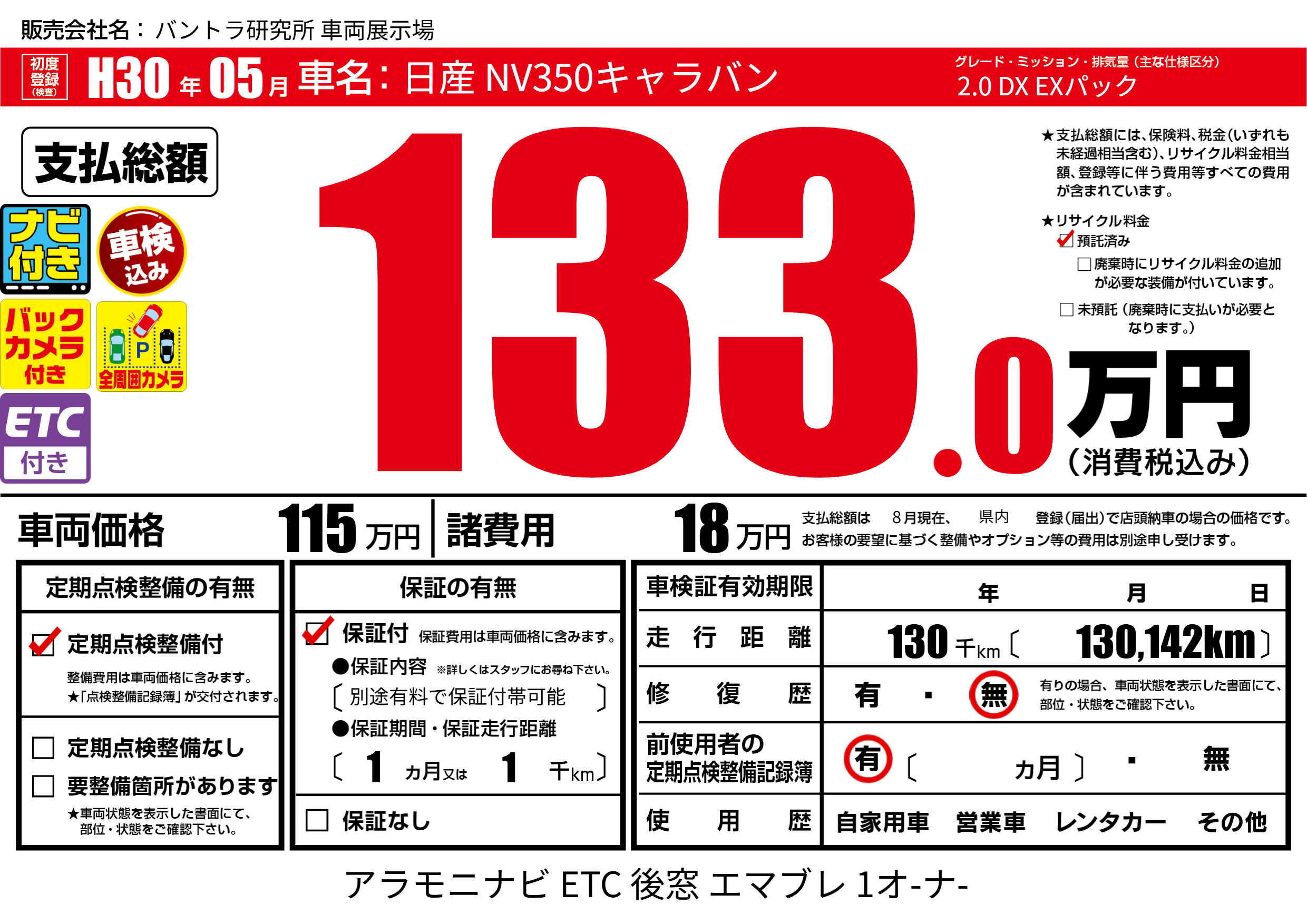 | 車名 | 日産 NV350キャラバン | グレード ミッション 排気量 |
