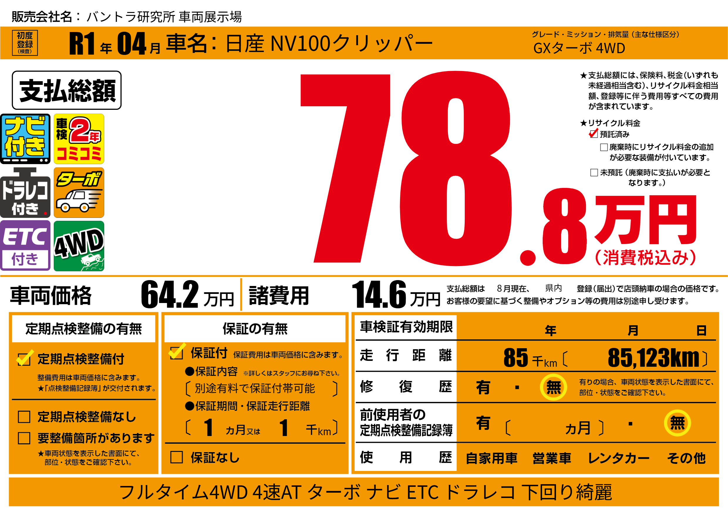 | 車名 | 日産 NV100クリッパー | グレード ミッション 排気量 |
