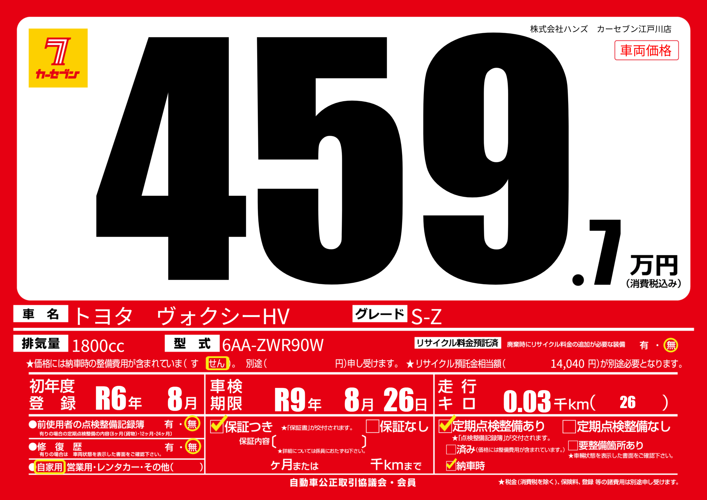 | 車名 | トヨタ ヴォクシーHV | グレード ミッション 排気量 |