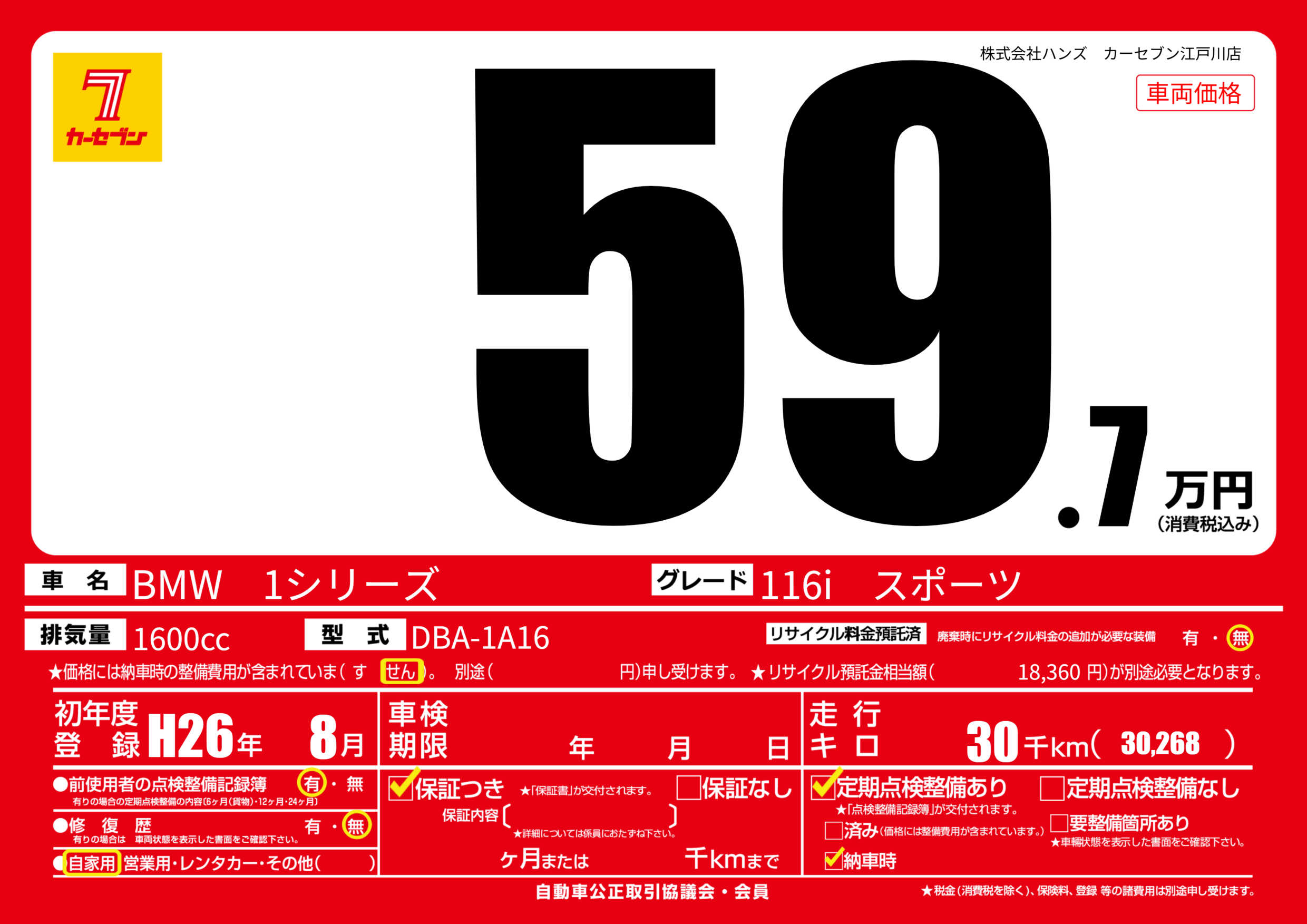 | 走行キロ | 3万km | 初年度登録 | H26年8月 |
