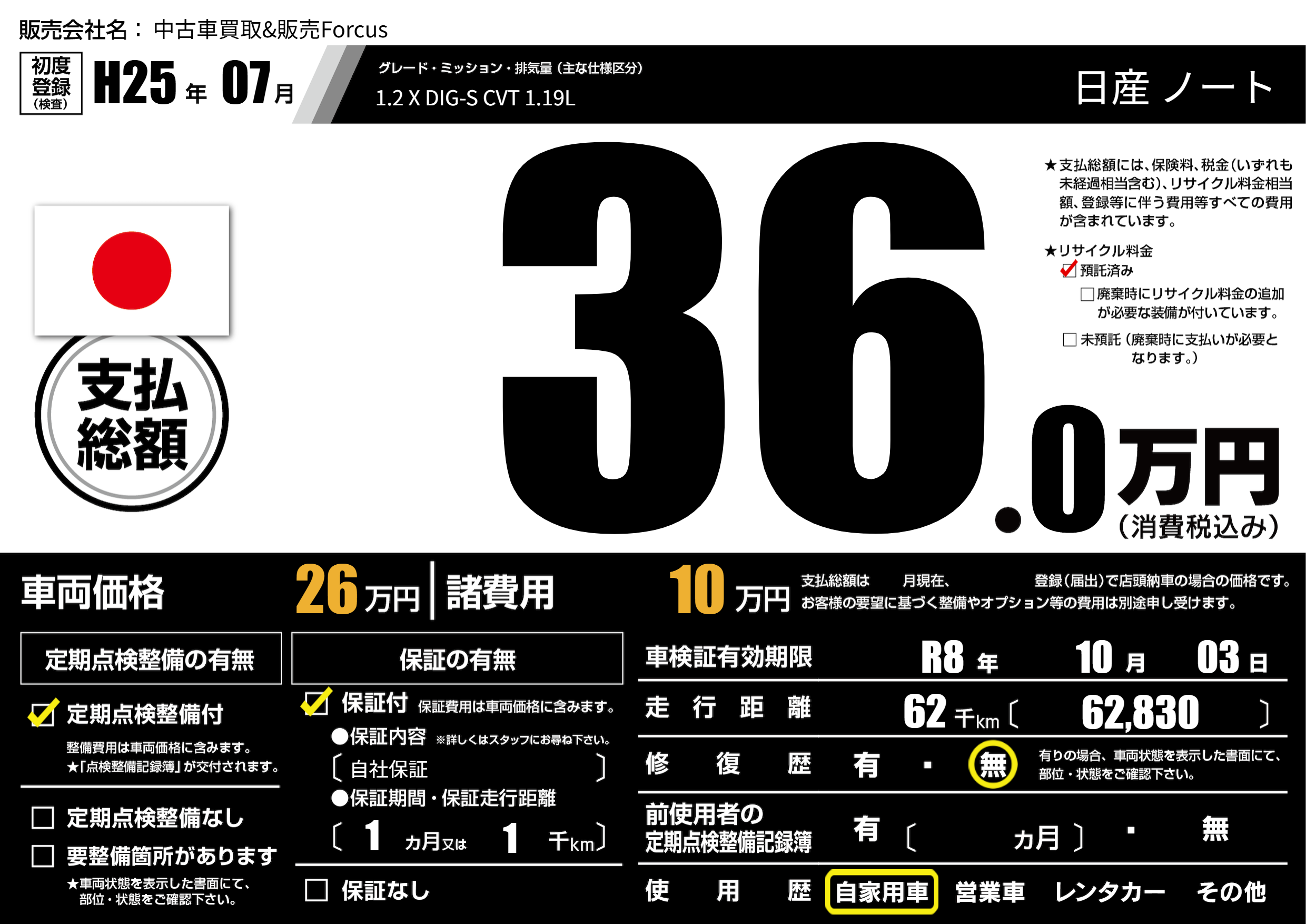 | 車名 | 日産 ノート | グレード ミッション 排気量 |