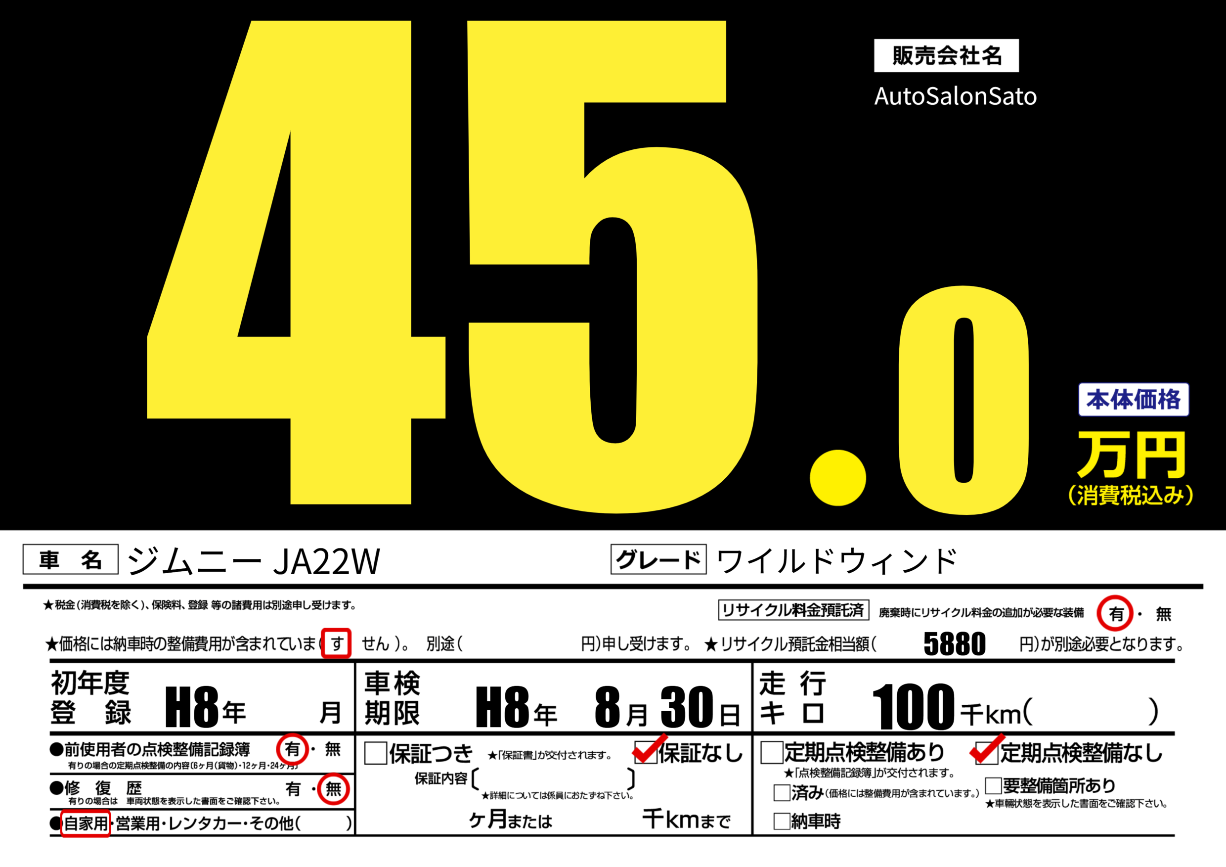 | 車検制限 | H8年 8月 30日 | ||