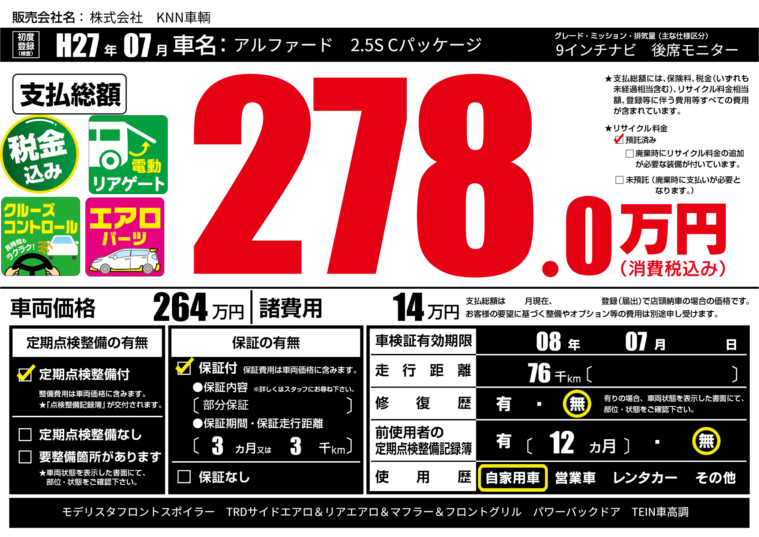 | 車名 | アルファード 2.5S Cパッケージ | グレード ミッション 排気量 |