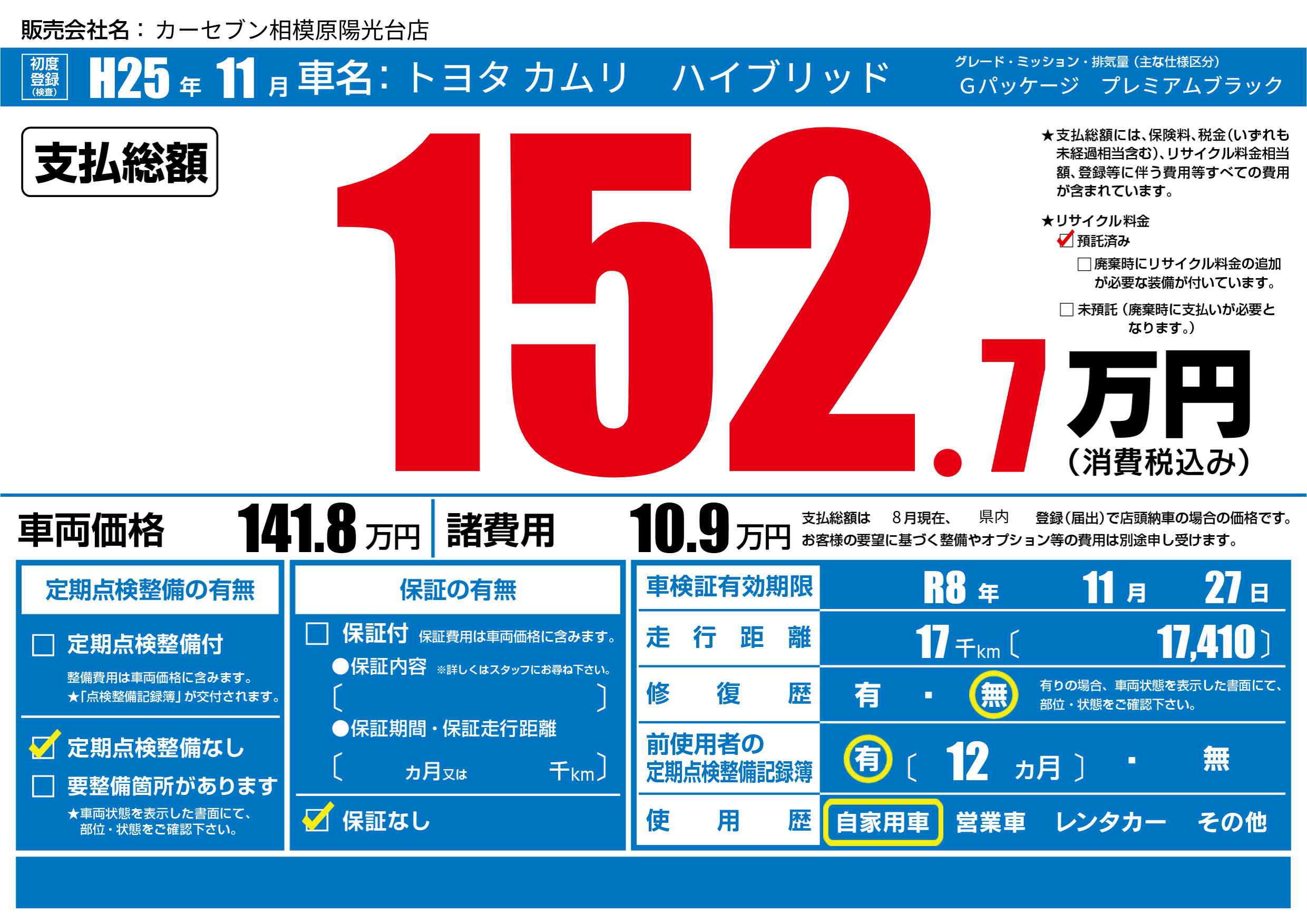 | 車名 | トヨタ カムリ ハイブリッド | グレード ミッション 排気量 |