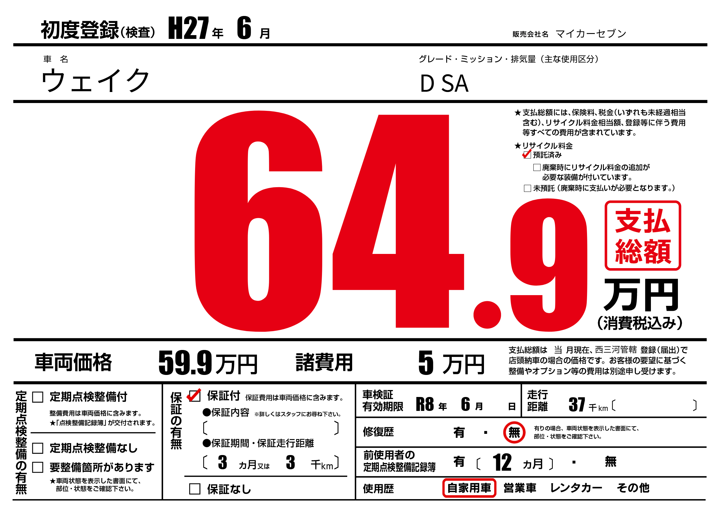 | 走行キロ | 3.7万km | 初年度登録 | H27年6月 |