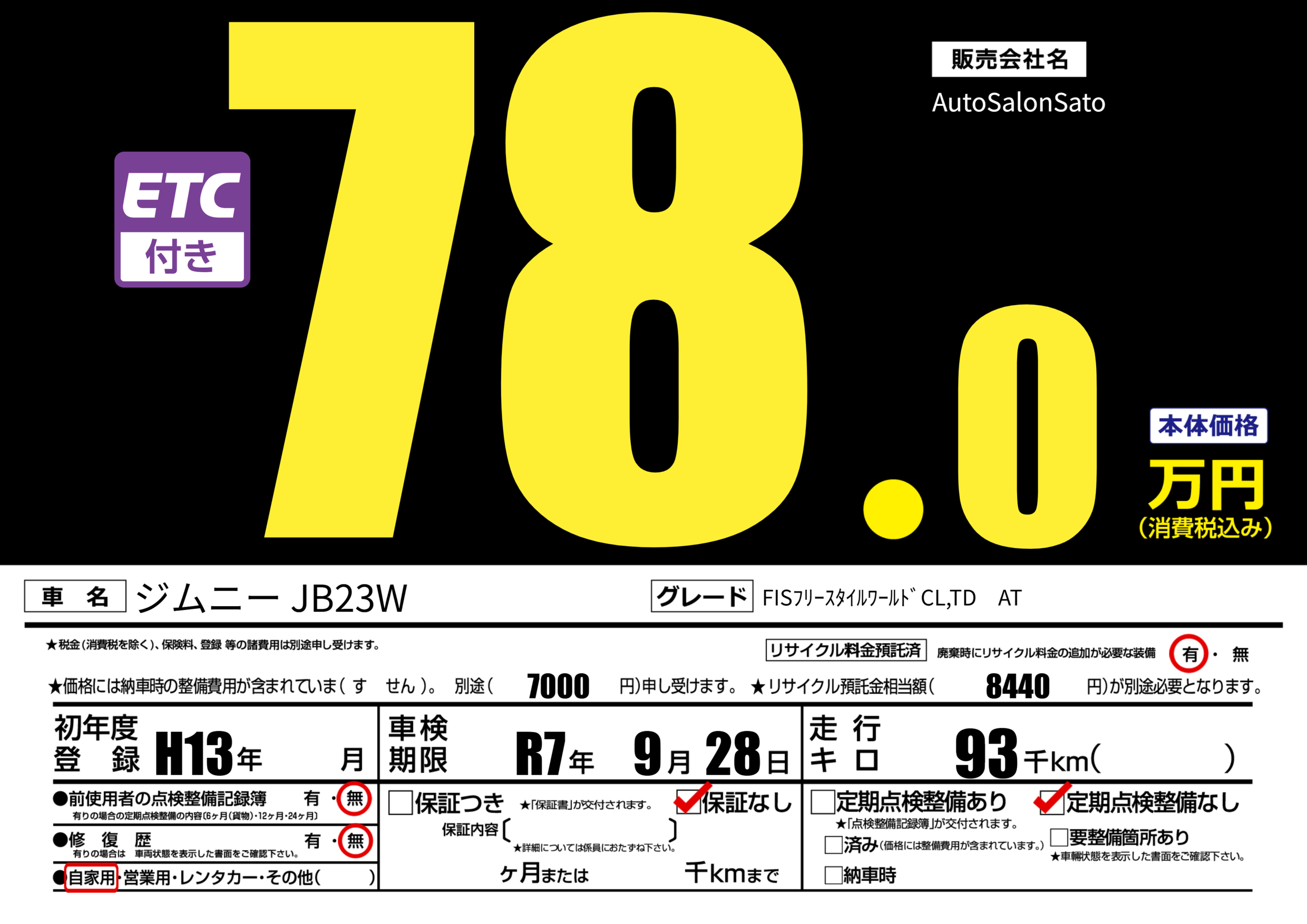 | 車名 | ジムニー JB23W | グレード ミッション 排気量 |