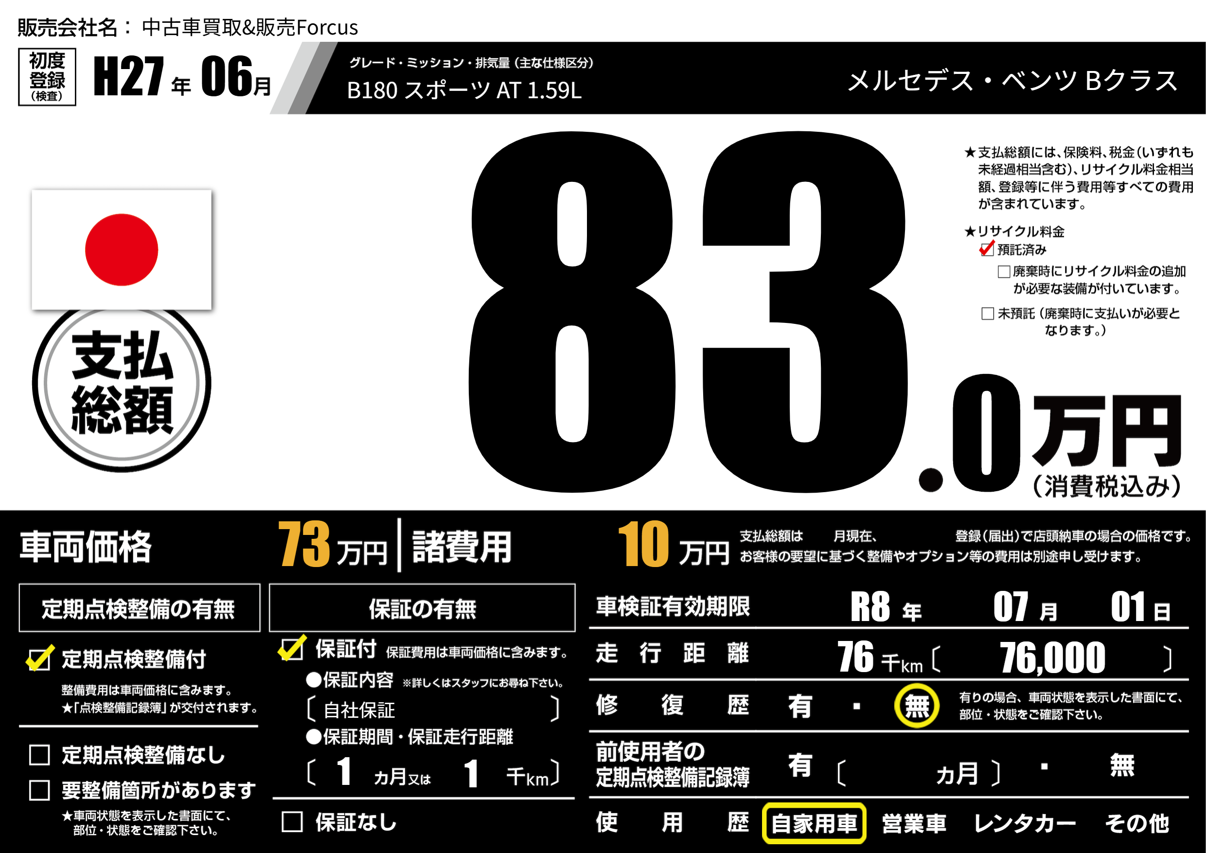 | 車名 | メルセデス・ベンツ Bクラス | グレード ミッション 排気量 |