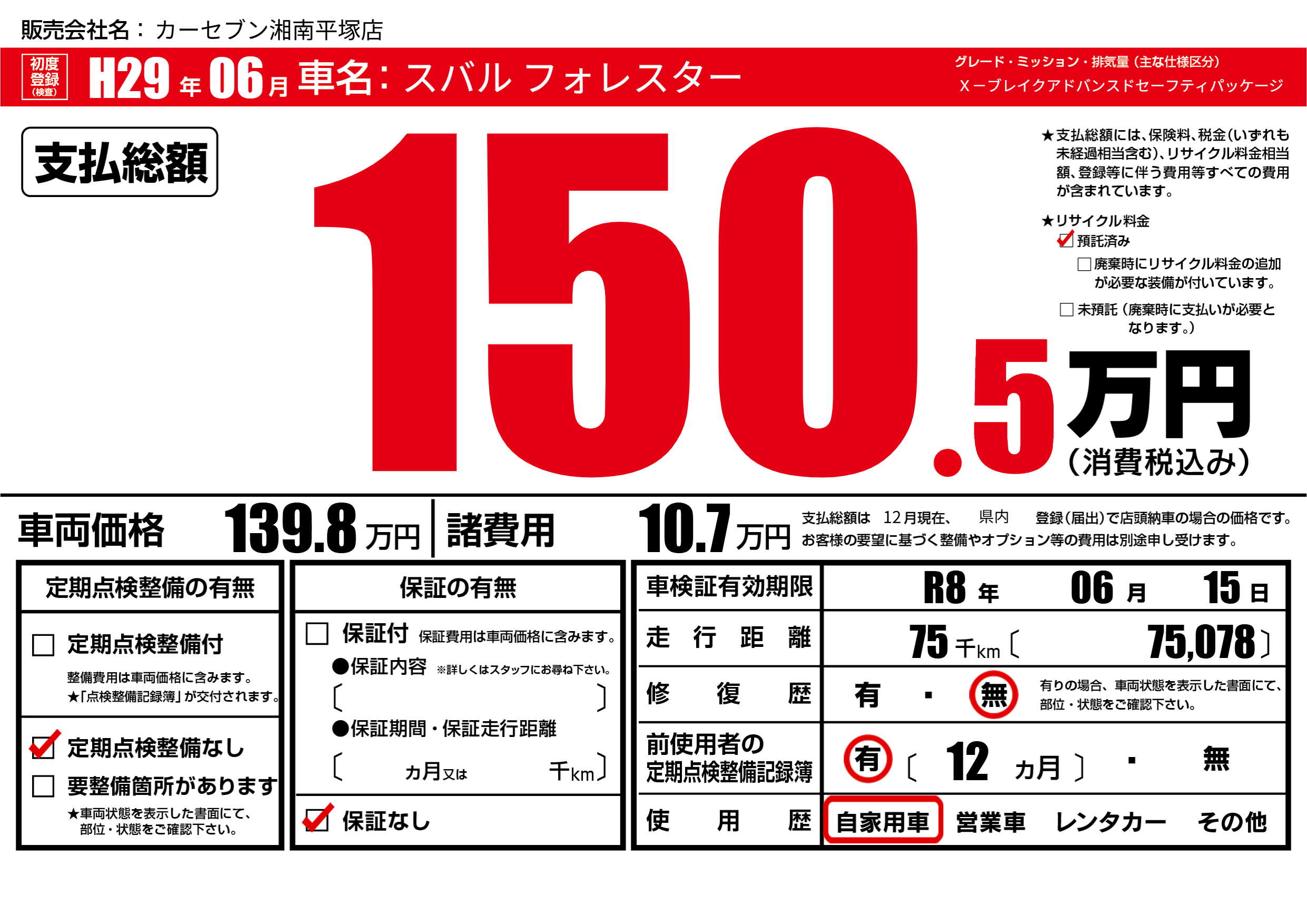 | リサイクル料金 預託済 |