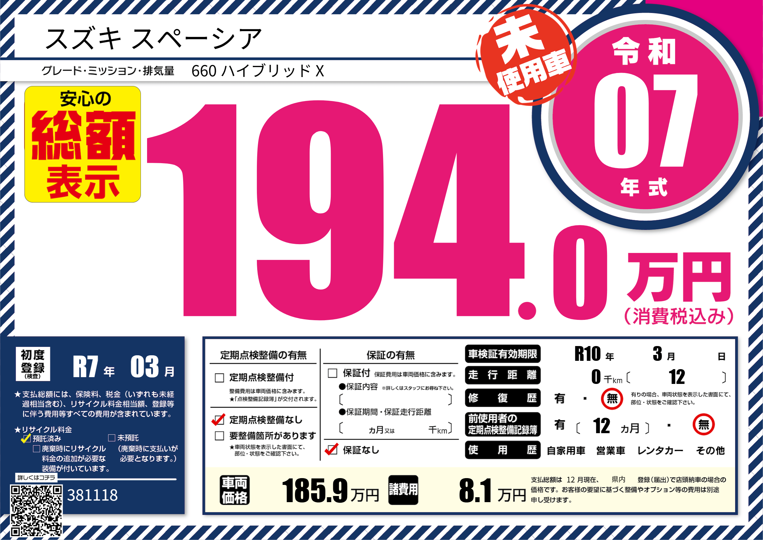 | 走行キロ | - | 初年度登録 | R7年03月 |