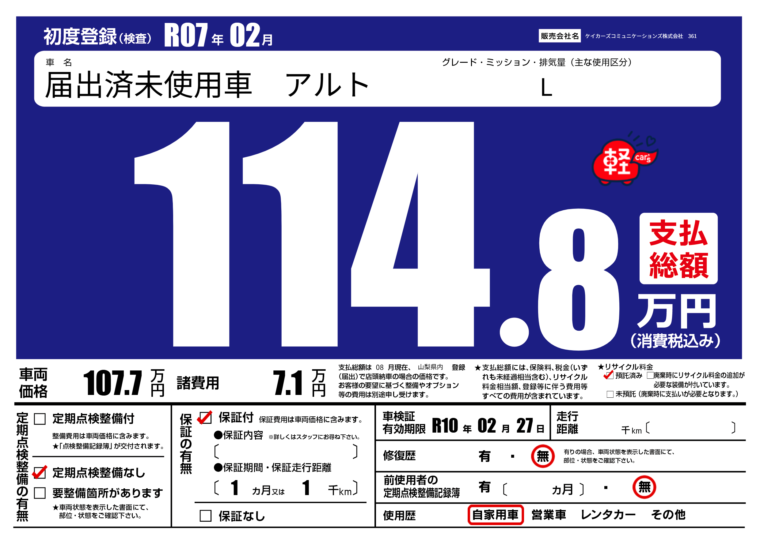 | 定期点検整備 | 定期点検整備なし | ||