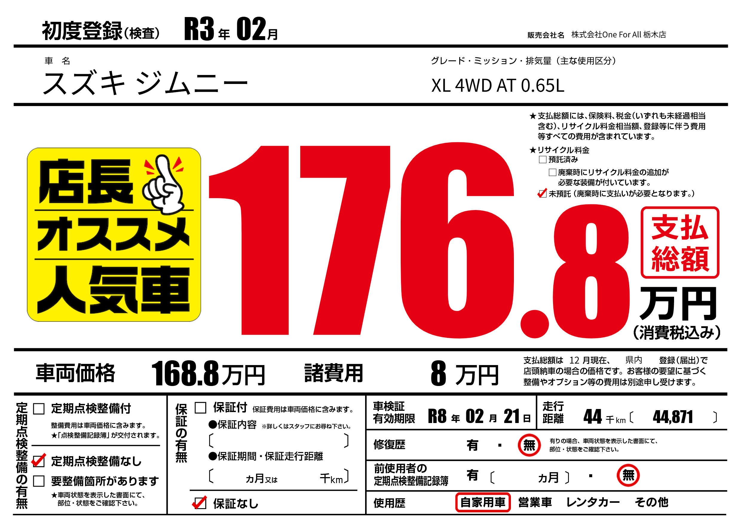 | 車名 | スズキ ジムニー | グレード ミッション 排気量 |
