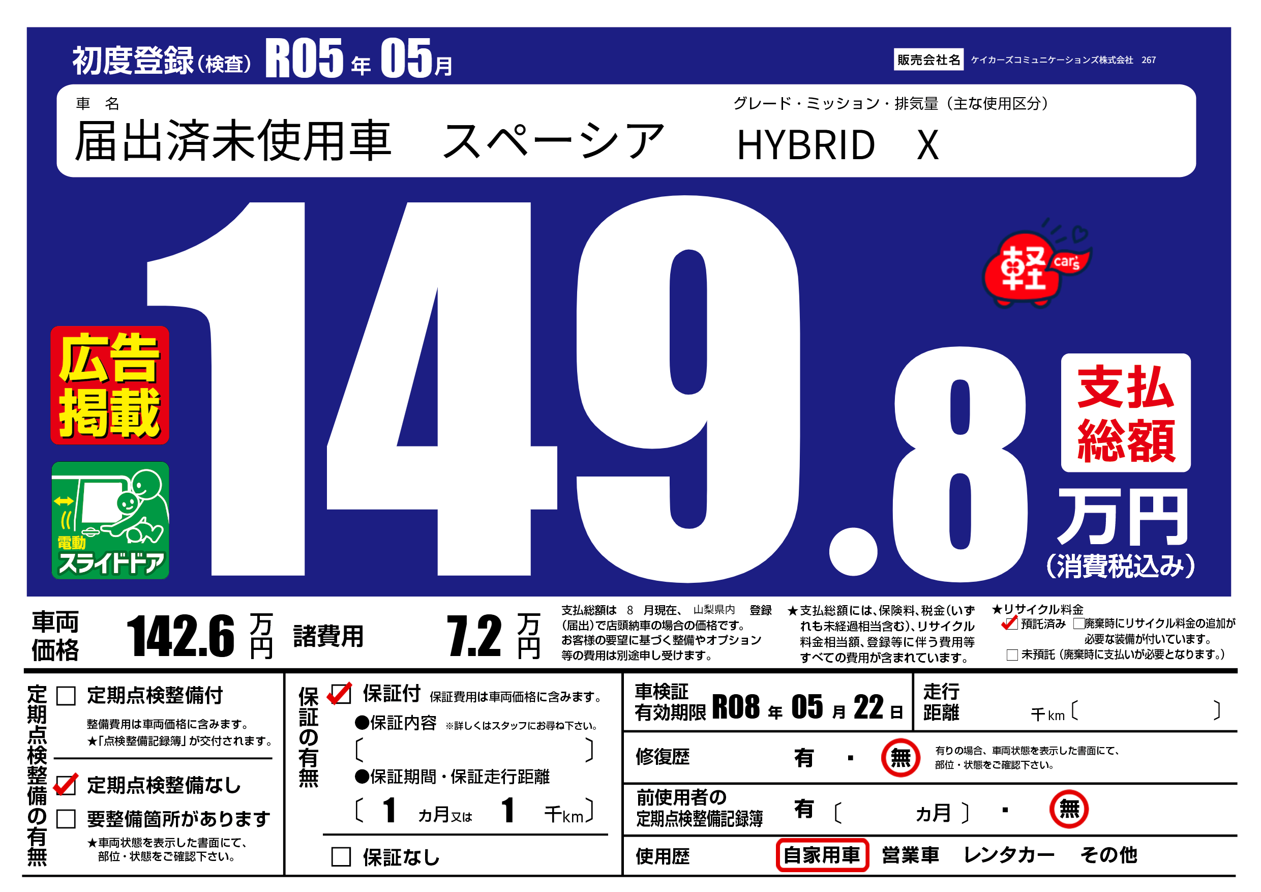 | 走行キロ | - | 初年度登録 | R05年05月 |