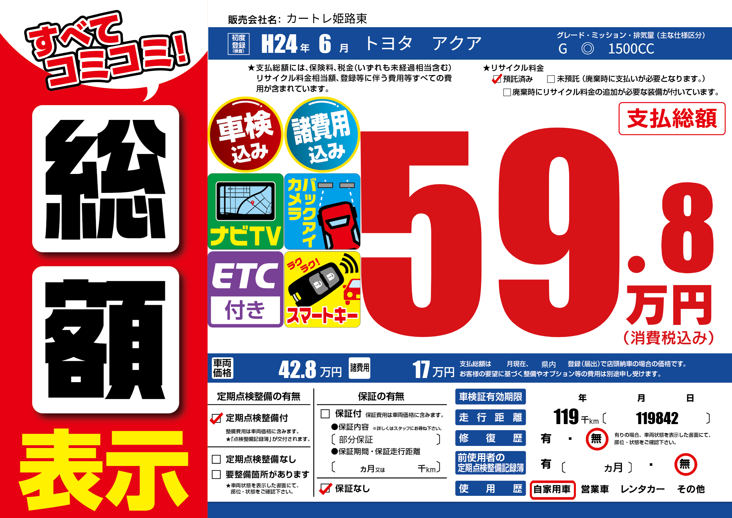 | 走行キロ | 11.9万km | 初年度登録 | H24年6月 |