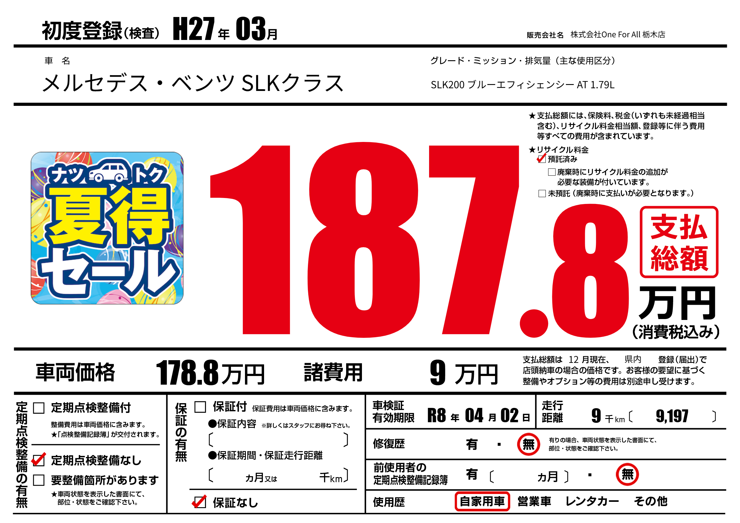 | 車名 | メルセデス・ベンツ SLKクラス | グレード ミッション 排気量 |
