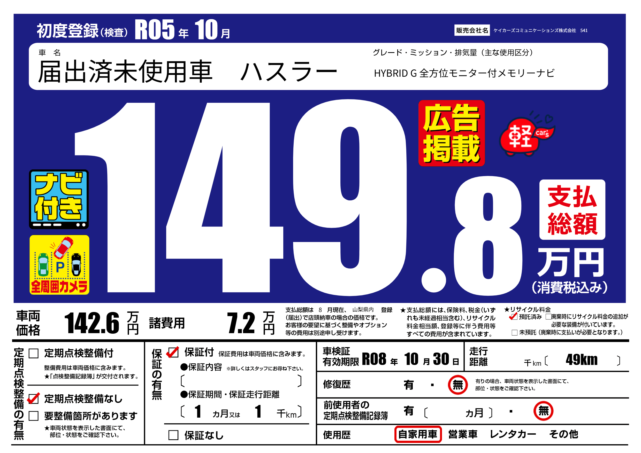 | 走行キロ | - | 初年度登録 | R05年10月 |